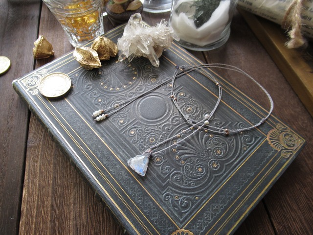 三角形の形状がとても愛らしい、思わず「ポリンキー」を口ずさみたくなるような、レインボームーンストーンを上品な華やかさのある繊細なペンダントにお仕立ていたしました。 ペンダントの紐には淡水パール、宝石質のアイオライト、宝石質のラブラドライトを編み込んでいます。 三角形の形状のレインボームーンストーンは、角度によって全体にロイヤルブルーの銀をやや帯びた淡いブルーのシラーが浮かび上がります。透明感の感じられる石質で、やわらかい色合いが目を引きます。 結び石は光沢感のある淡水パールをセレクトしました。全体的にとても軽い付け心地ですので、肩こりなどの負担もかなり軽減されている仕様になっています。 とてもかわいいこちらの形状のルースはなかなか仕入れが難しい、……楕円や雫は多いのですが、円形と並んでなかなか見つからない形状です。これは!と思う時にだけ仕入れるようにしております。 編み糸は仕様によって肌なじみがしていき、少しずつ柔らかくなっていきます。アクセサリーにはアジャスターを編み込んでおります。最初は固く感じるかもしれないのですが、仕様ごとに少しずつスムーズに動くようになります。 それでも硬い場合は、10cmほど離した位置から「弱風~中風」くらいのドライヤーの熱を当てていただくと、ワックスコードの蝋が溶けて糸に馴染みやすくなります。硬い場合はお試しくださいね。(タオルの上に乗せておくとよいです) <Composition> メイン糸色:グレー レインボームーンストーン 13×13mm ペンダント紐:約80cm (編み込みアジャスター仕様) パーツ:14kgf、淡水パール、宝石質アイオライト&ラブラドライト ーーーーーーーーーーーーーーーーーーーーーー ◇ご注文の前に必ずお読みください ⇒https://note.com/hcw451/n/na6dcb5bbd075 ※送料他、2024年10/1~改定しております。 ※はじめてご注文いただくお客様は「必ず」お読みください。また、定形外郵便での発送に関して、土日祝日を挟む場合は通常より到着に時間がかかる旨も記入しております。必ずお読みください! ※再販リクエスト・オーダー・セミーダーは受注件数が2028年末までいっぱいの為、現在お受けしておりません。 ※追跡サービスのご利用や通常配送より早く到着希望の場合は「レターパック(ライト)」をご選択ください。2024年10月より郵便局の配送料金が値上がりの為、10/1より価格が変更となります。