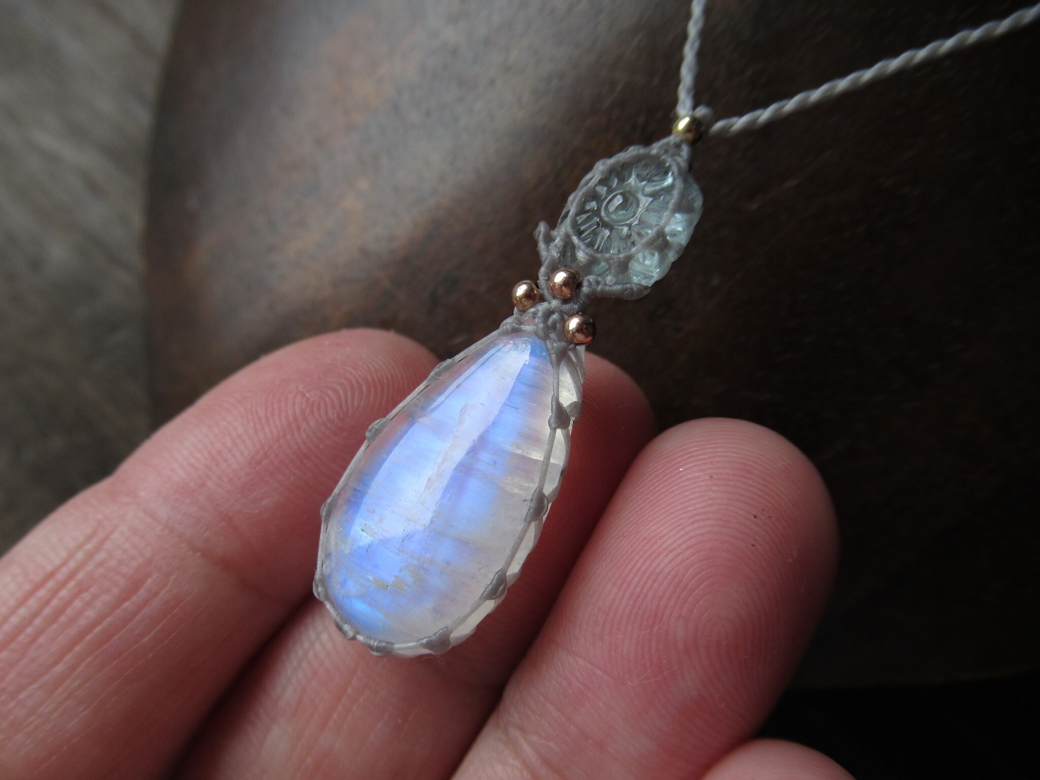 お花模様が彫り込まれた宝石質のごく淡いアクアマリンに、角度によってとても滑らかで美しい輝きを見せてくれるホワイトラブラドライトをあしらいました。滑らかで幻想的なシラーをお楽しみいただけます。