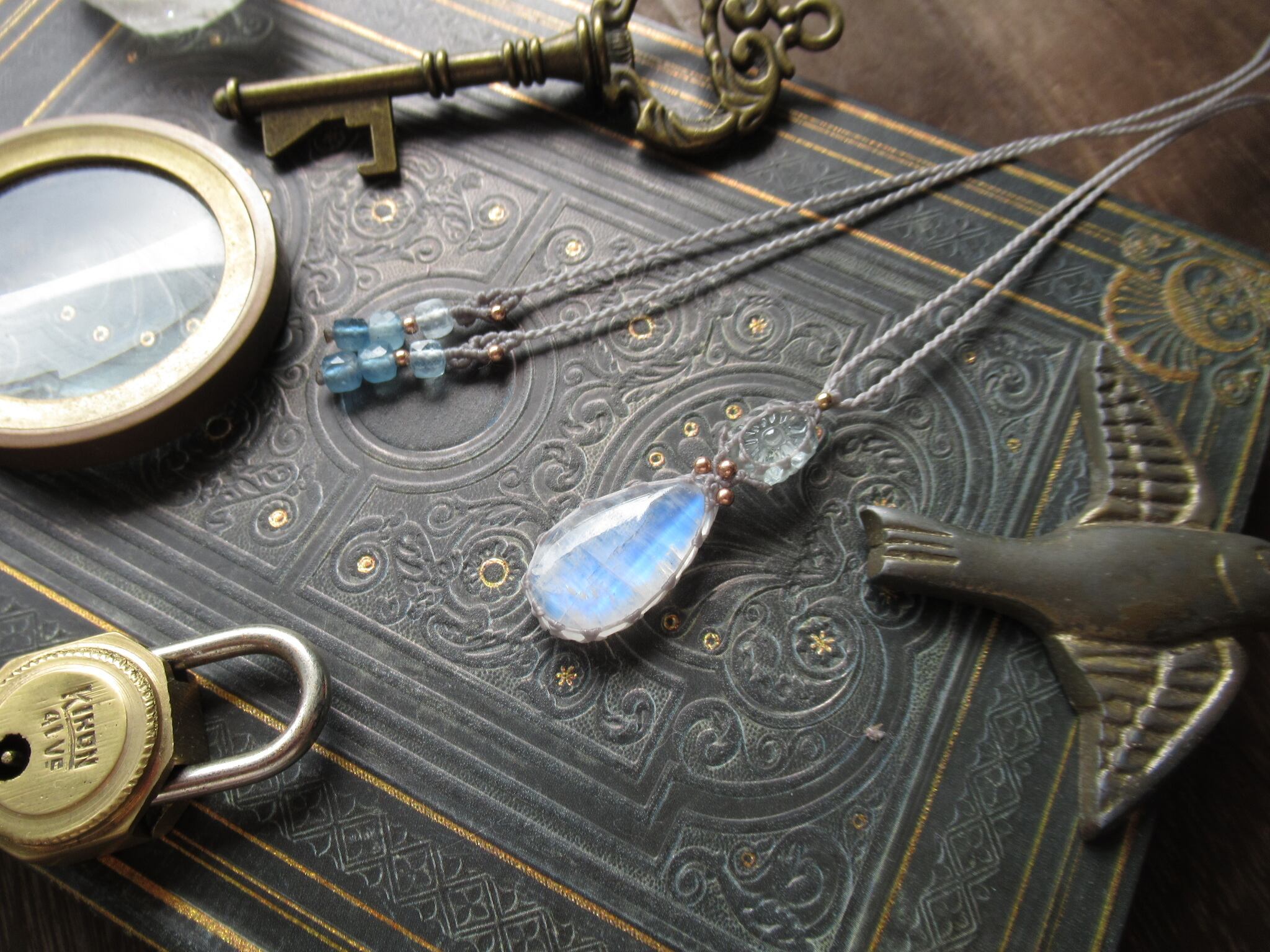 お花模様のアクアマリン×ホワイトラブラドライトのペンダント