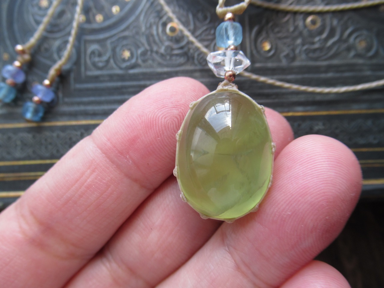 こちらのプレナイトのお色は少し濃いめで、濃い目のシャインマスカットのようなお色です。プレナイトらしい結晶の形状がわかる部分があります。ルースは全体的にきれいに研磨されており、小傷などは見当たりません。内部の、葡萄状の房が連結したような部分に、小さな三角形に近い模様が見えます。(指先に乗せている写真だと少しわかりやすいかもしれません)