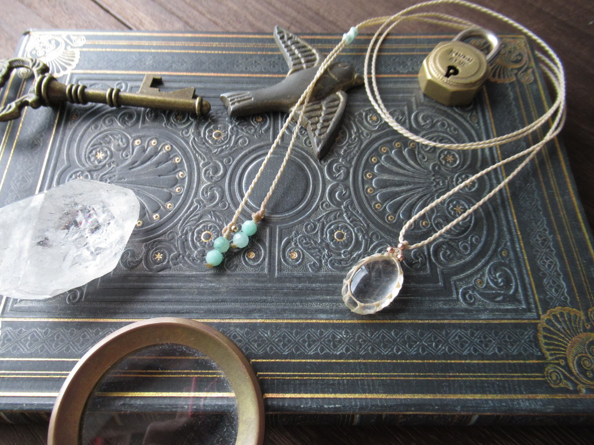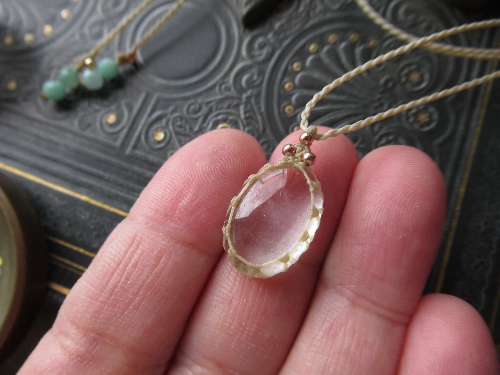 ごくごくシンプルに、水晶の透明感を行かせるように編み込藻い、結び石にはコロンビア産のエメラルドのビーズをあしらいました。