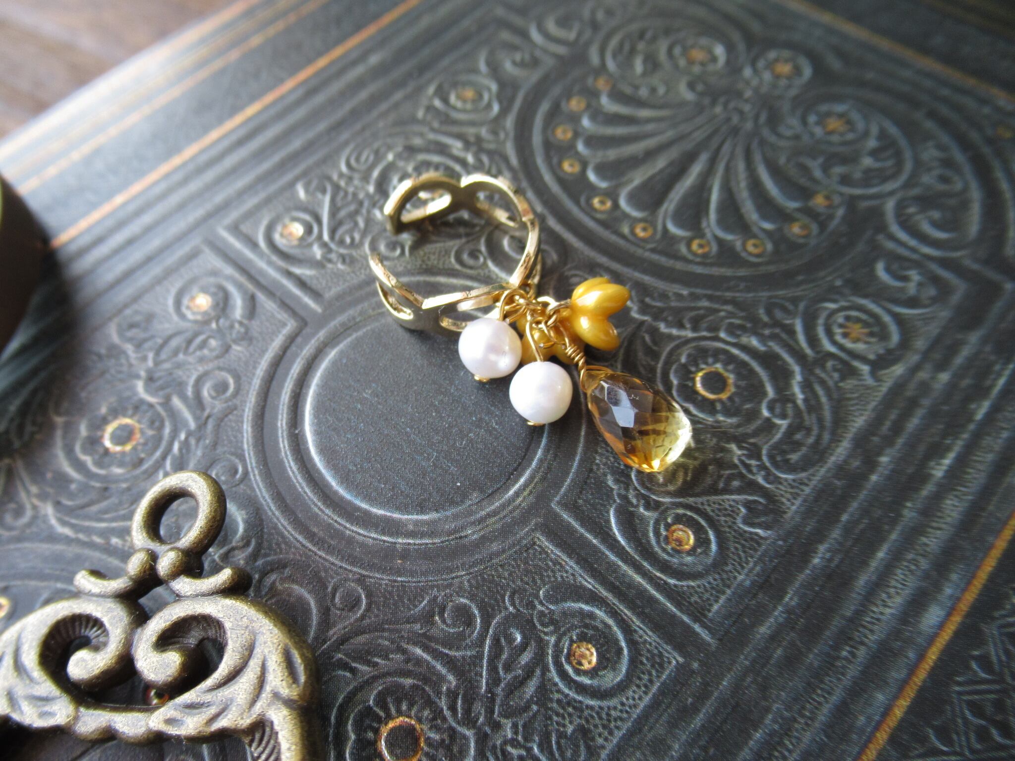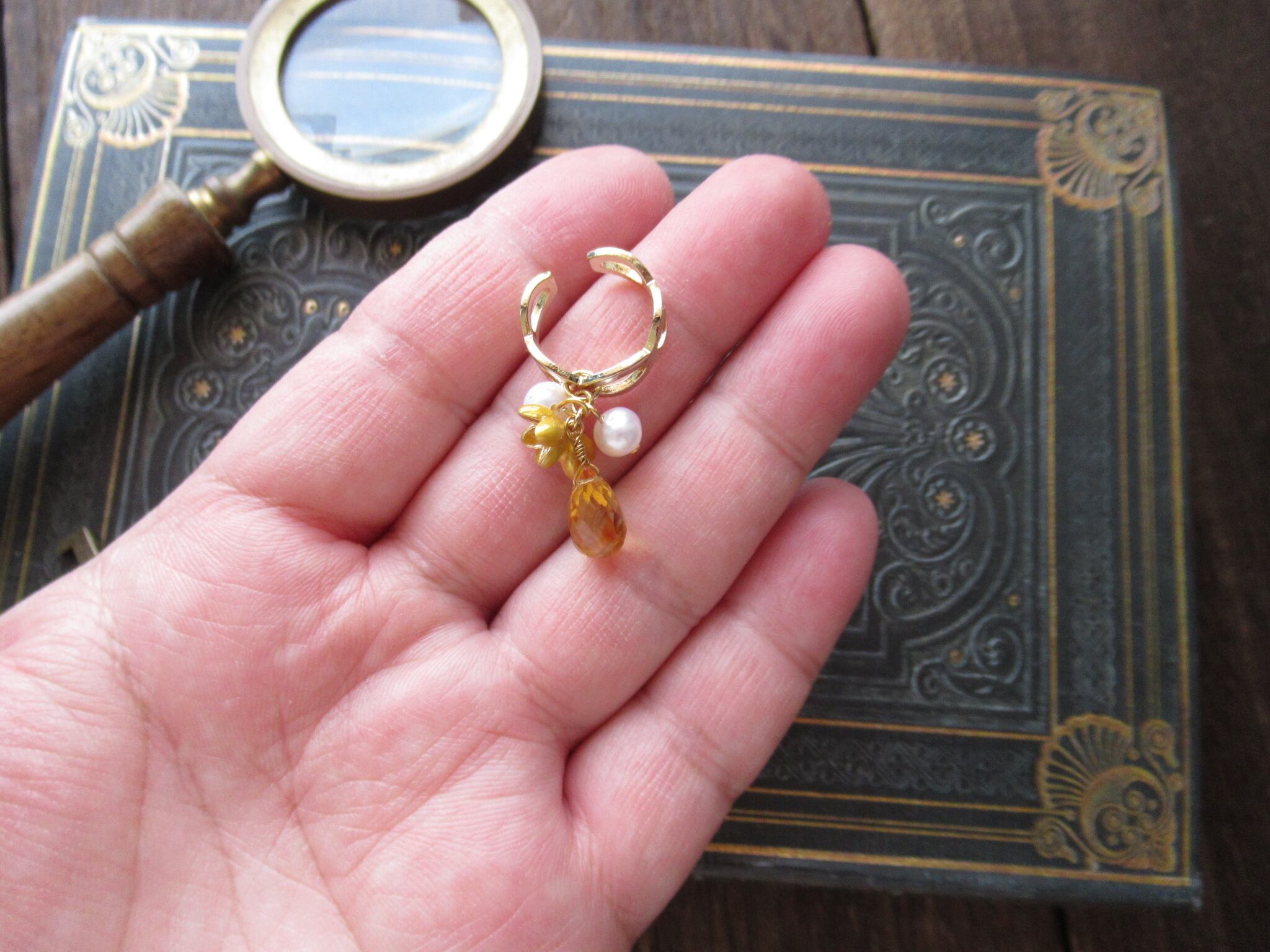 黄色の二花ひっついたチャームをあしらった雫タイプの天然石のイヤーカフです。