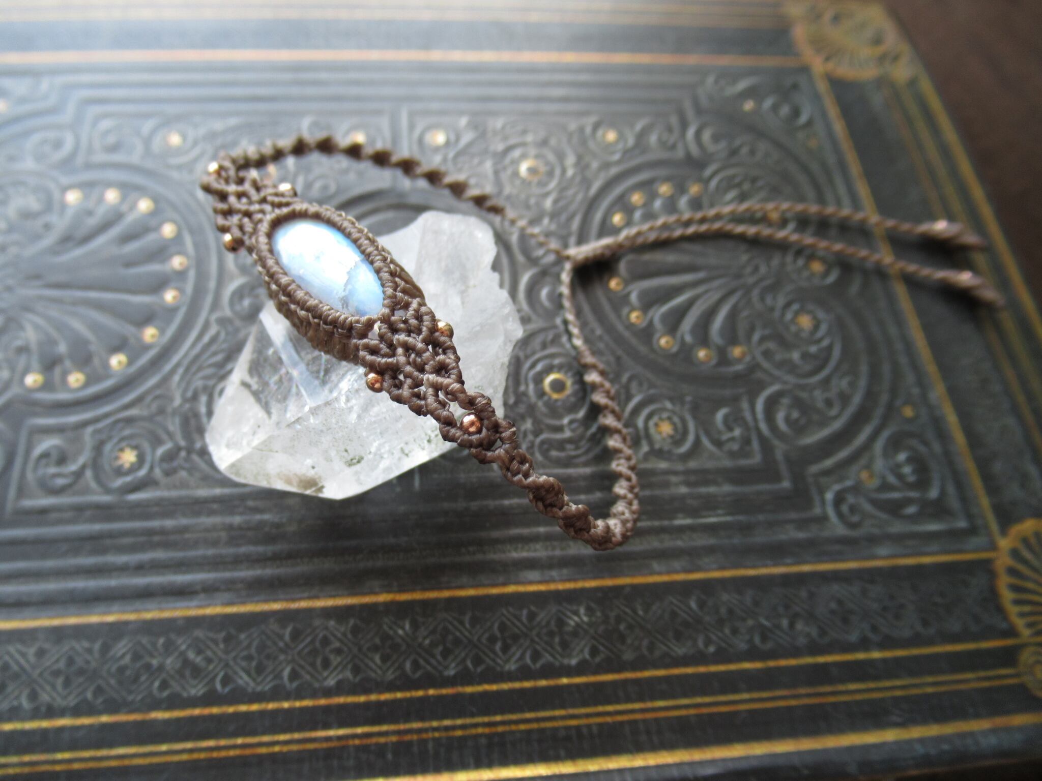 角度によってとても美しい輝きを見せてくれる、レインボームーンストーン(ホワイトラブラドライト)でマクラメらしい編み込みを左右に施したブレスレットをお仕立てしました。