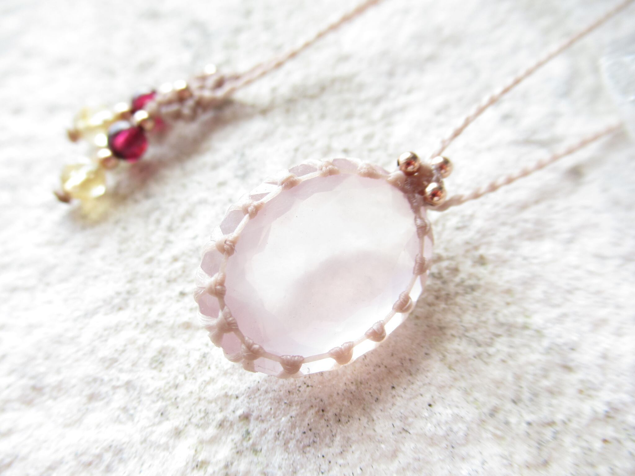 ややスコロライトのようなミルキー間のある透明な桜色です。結び石はガーネット、シトリンをセレクトいたしました。