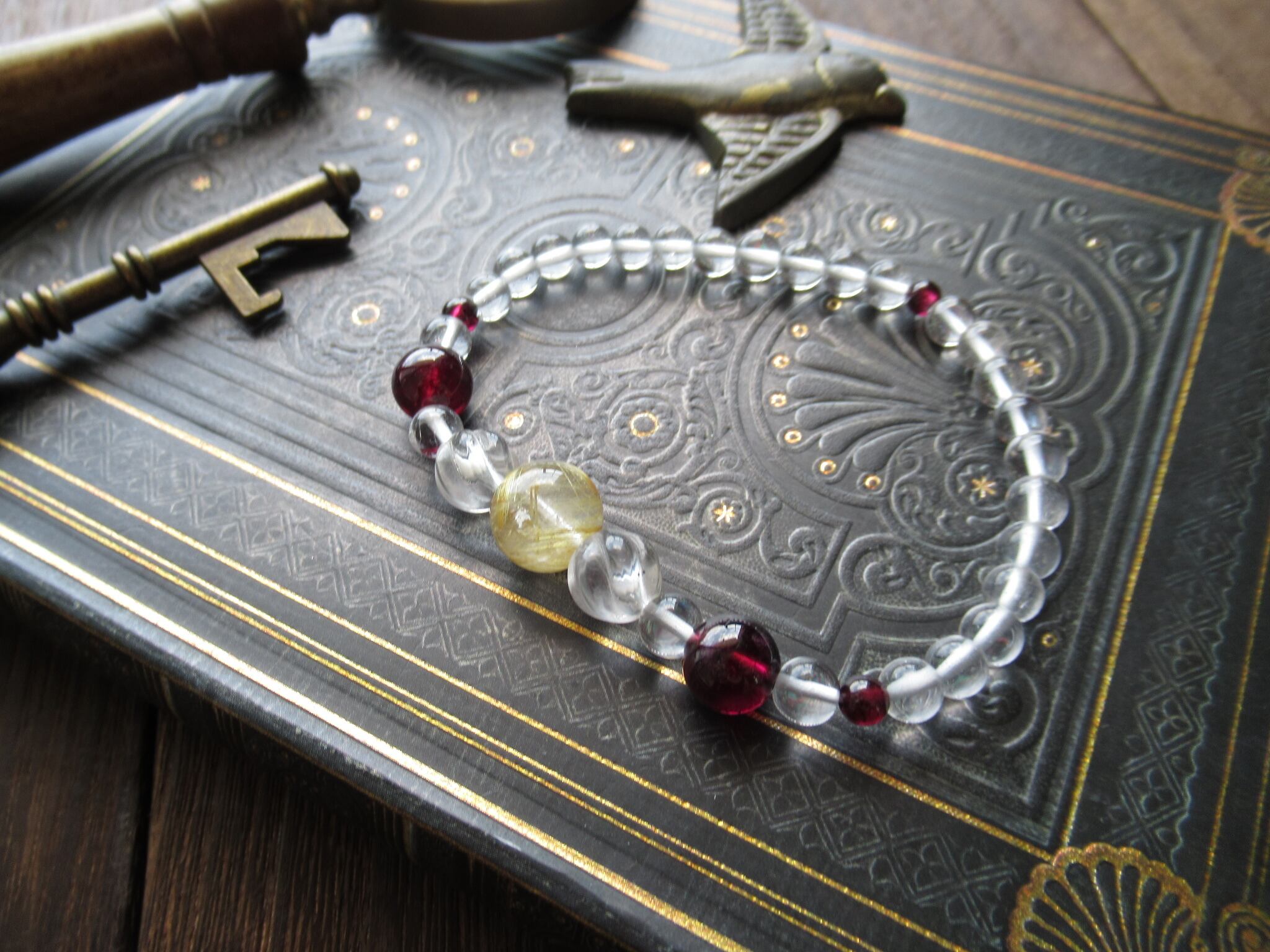 ルチルクォーツとガネーシュヒマール水晶、ロードライトガーネットのゴムブレスレットです。