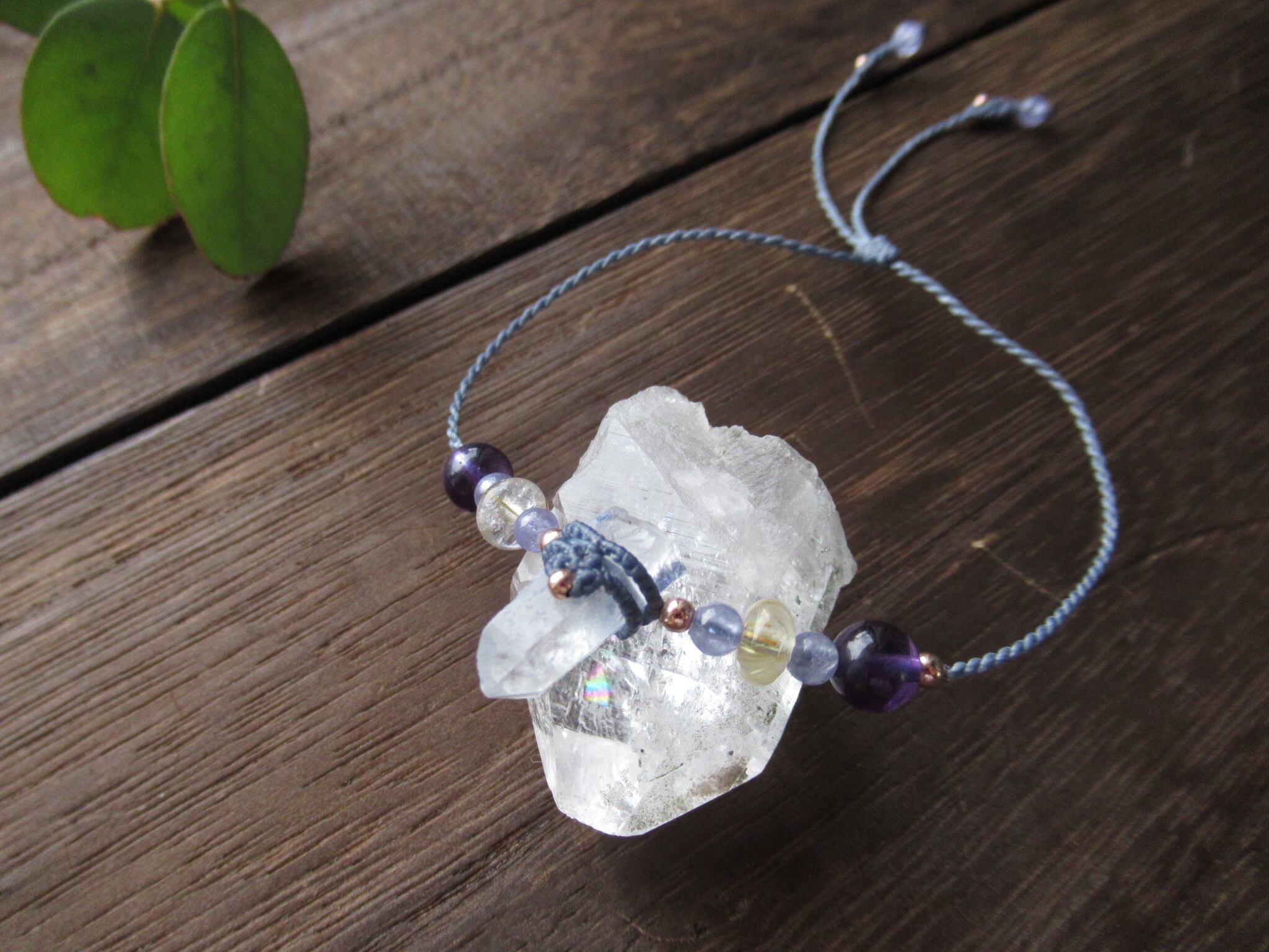 小さめですが可愛らしいサイズ感のデュモルチェライトインクォーツの原石をメインにブレスレットをお仕立ていたしました。
