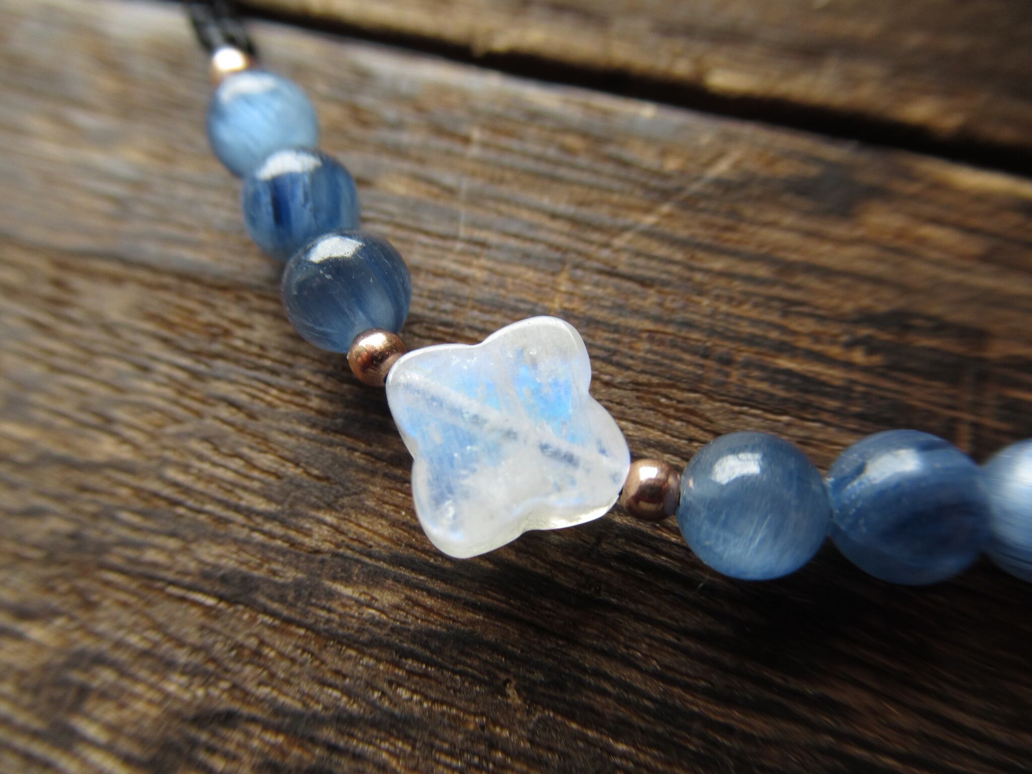 お花のような形のレインボームーンストーン(ホワイトラブラドライト)と濃い目の青色の輝きが美しいカイヤナイトで手首にスッキリと絡まるブレスレットをお仕立ていたしました。