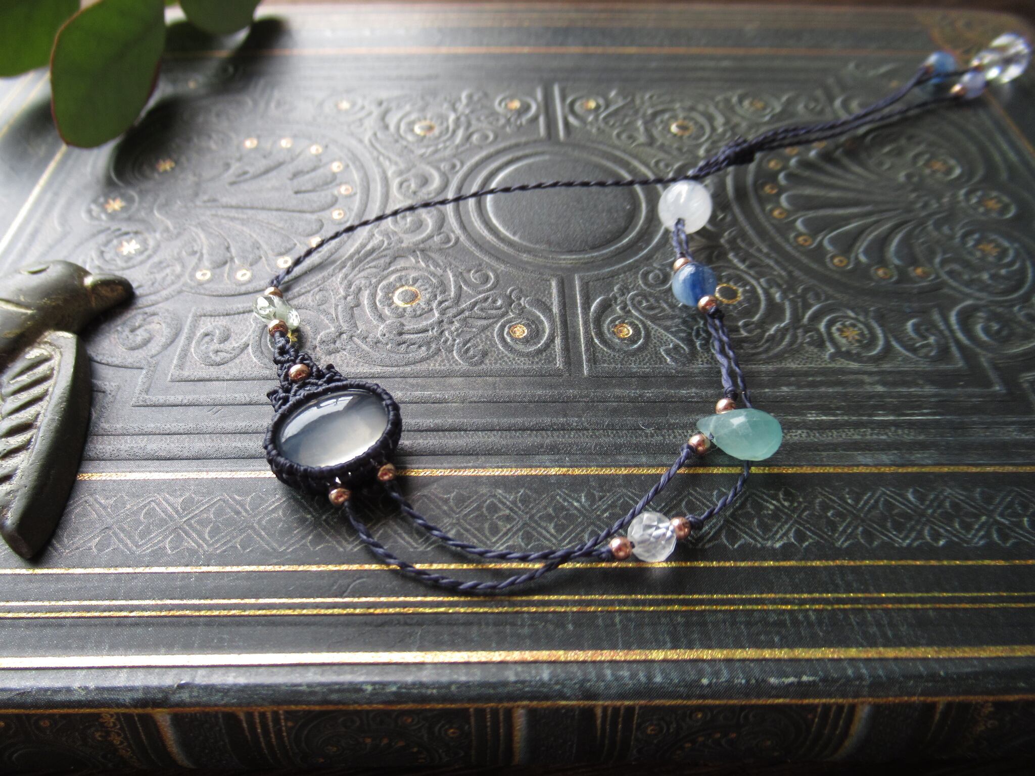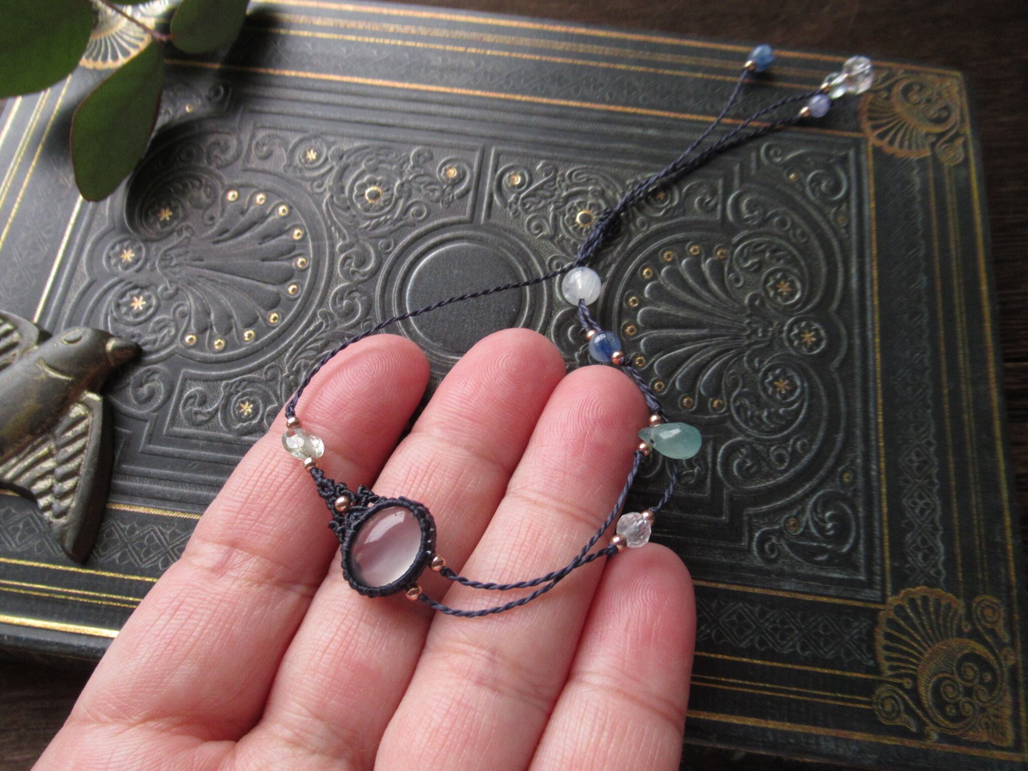 月の石であるムーンストーンの輝きがとても美しく幻想的で、月読尊をイメージしながら編みました。暗闇の中で軽やかに舞い踊るその手首にしゃらり、しゃらりと蛍火のような光を淡く放つこのブレスレットが絡まっているというようなイメージです。