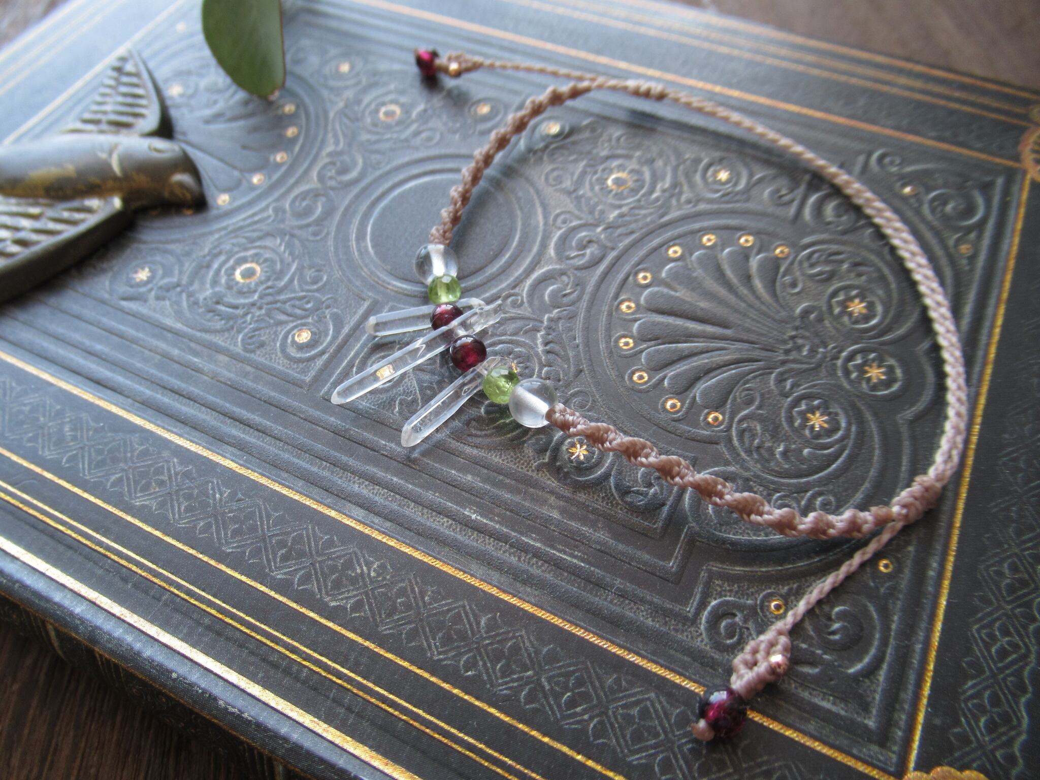 ブラジル産ポイント水晶とガネーシュヒマール産水晶、宝石質ペリドット、ロードライトガーネットを組み合わせアンクレットをお仕立ていたしました。