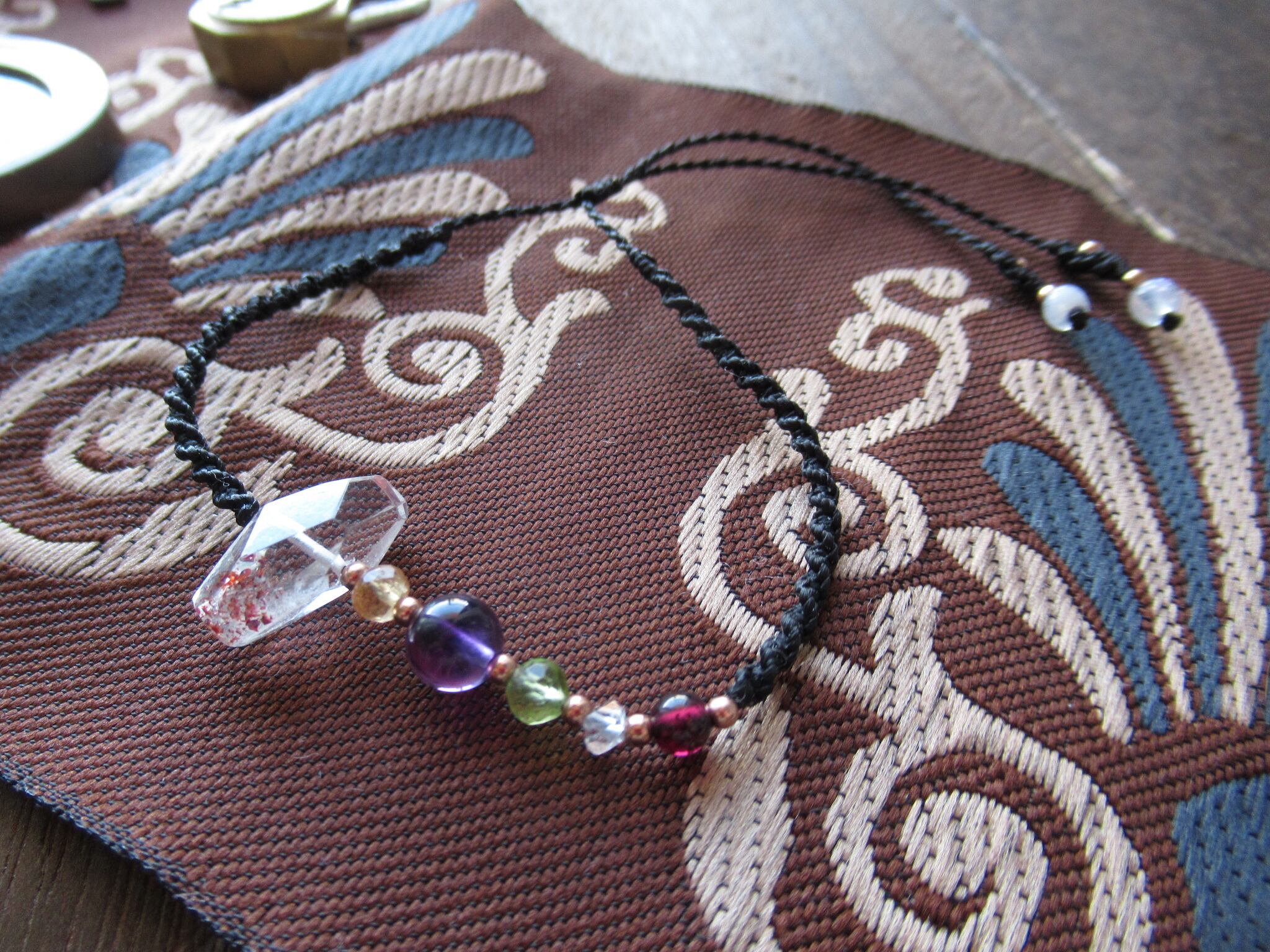 天然石ビーズはインペリアルトパーズ(宝石質)、アメジスト(宝石質)、ペリドット(宝石質)、ハーキマーダイヤモンド原石、ロードライトガーネットです。パキっとしたコントラストが、ぐっと映える粒感の美しい天然石をセレクトしております。