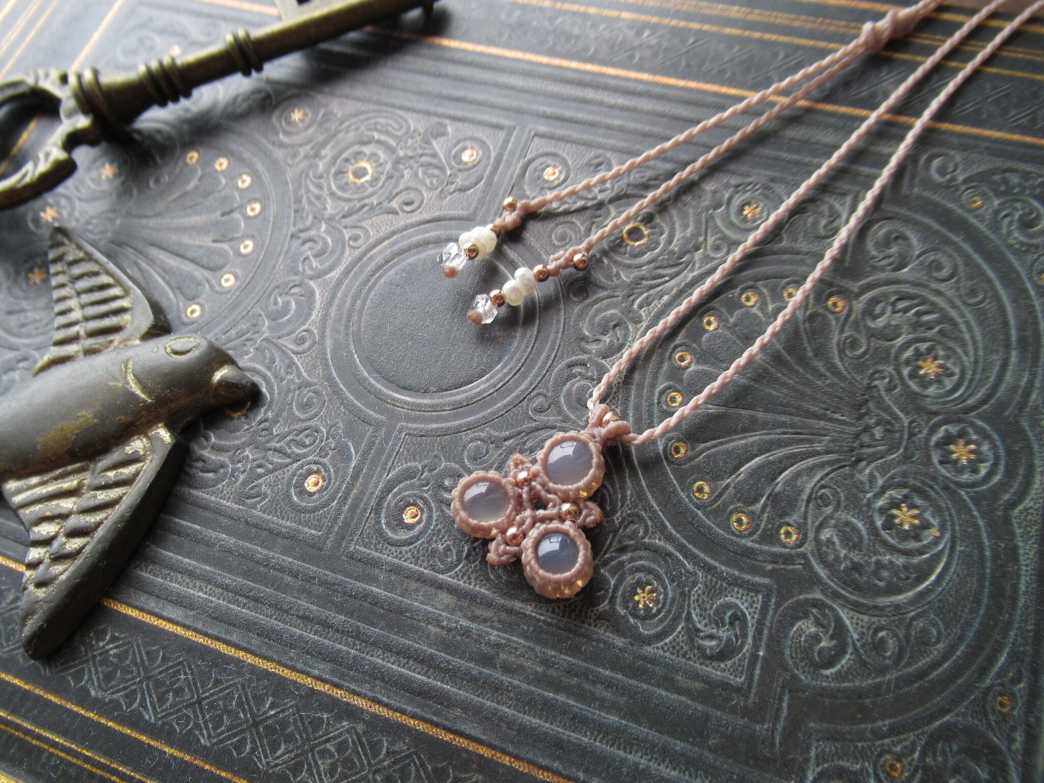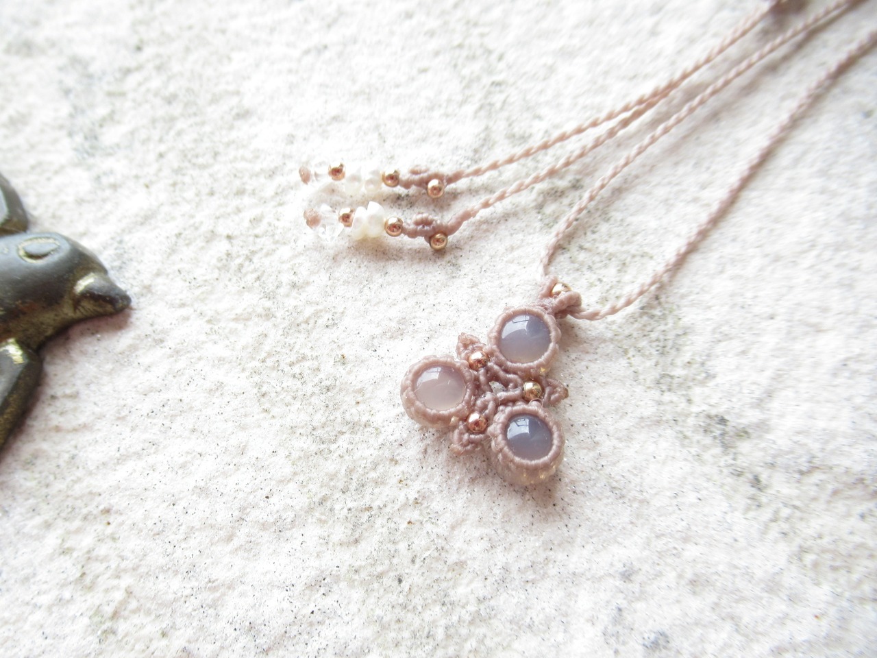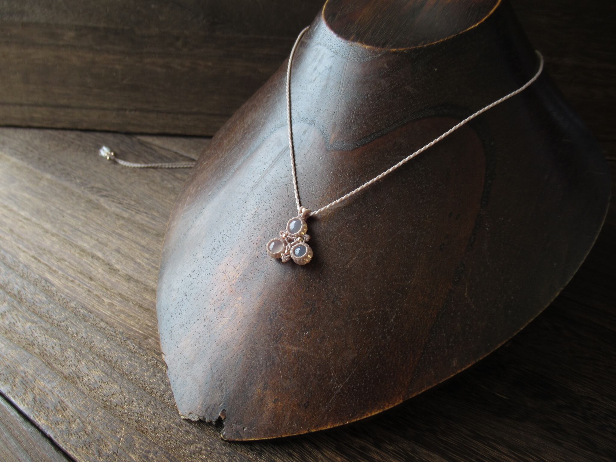 ささやかな粒感のグレームーンストーンに似た、グレーオニキスで魔除けの意味を込めてデルタペンダントをお仕立ていたしました。