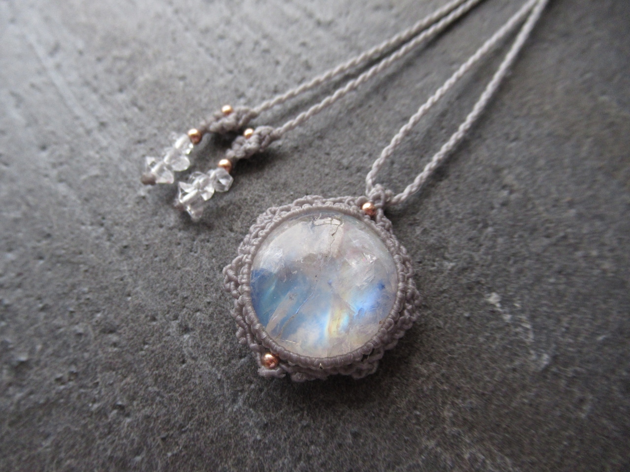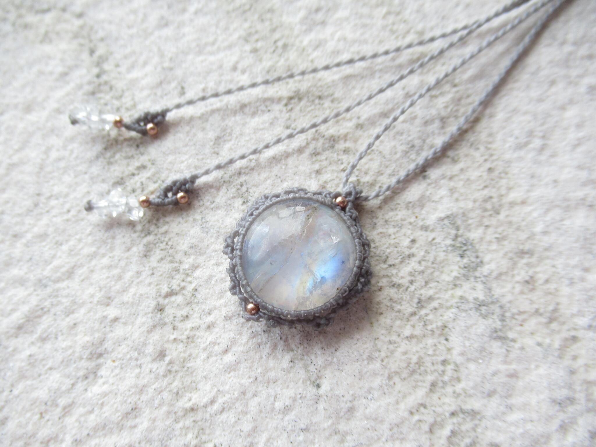 幸運が良い方向へ増え、運が舞い込んできますように、と思いを込めて丁寧に編み上げております。美しいレインボームーンストーンの輝きを、是非胸元でお楽しみいただけましたら幸いです。