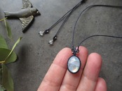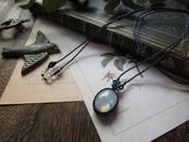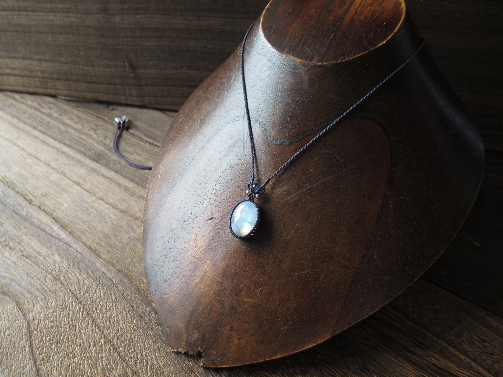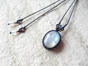 レインボームーンストーン特有の美しいシラーと、宝石質のカイヤナイトの深い色が絶妙に調和しています。胸元でVラインになるように仕上げております。