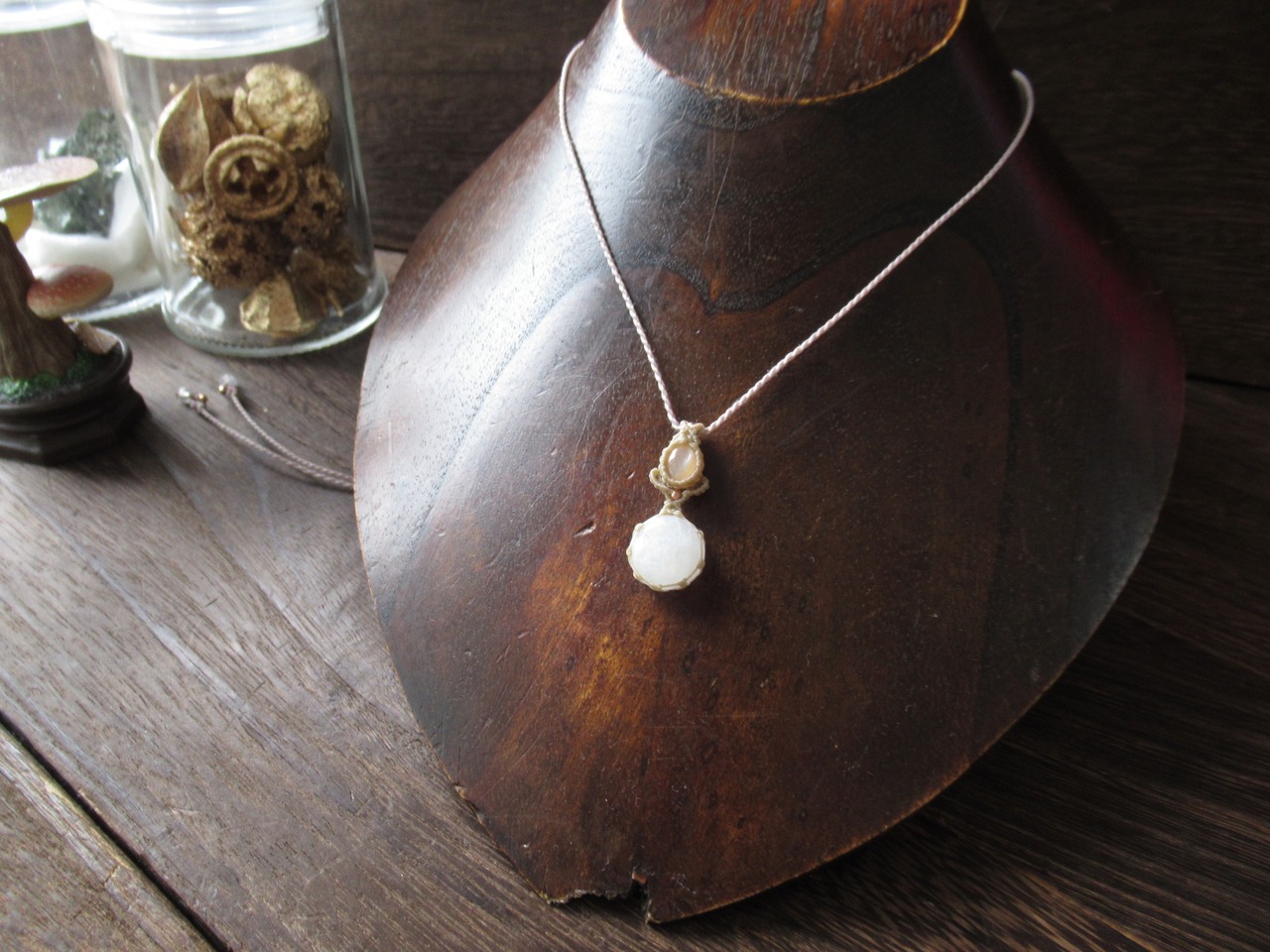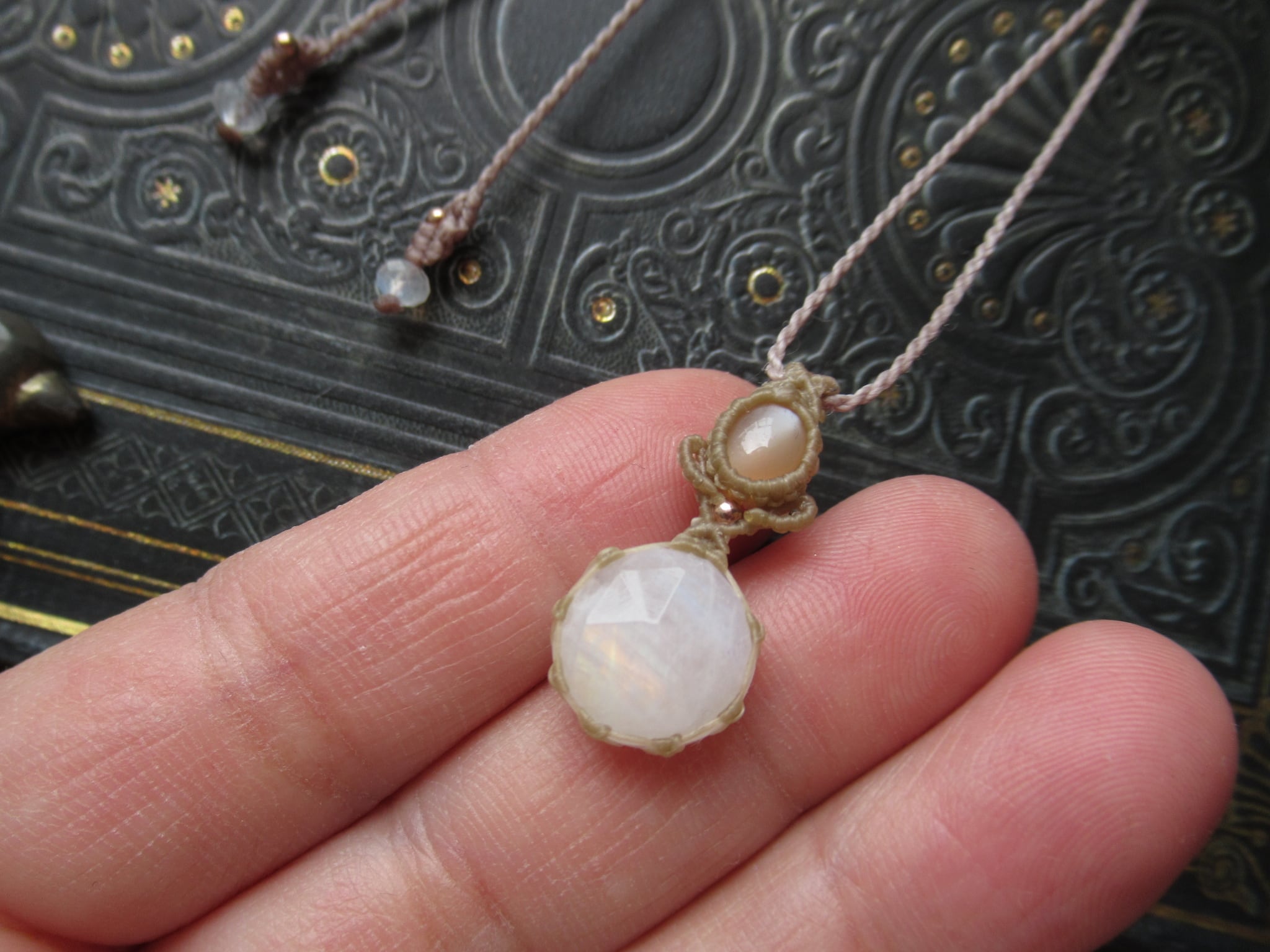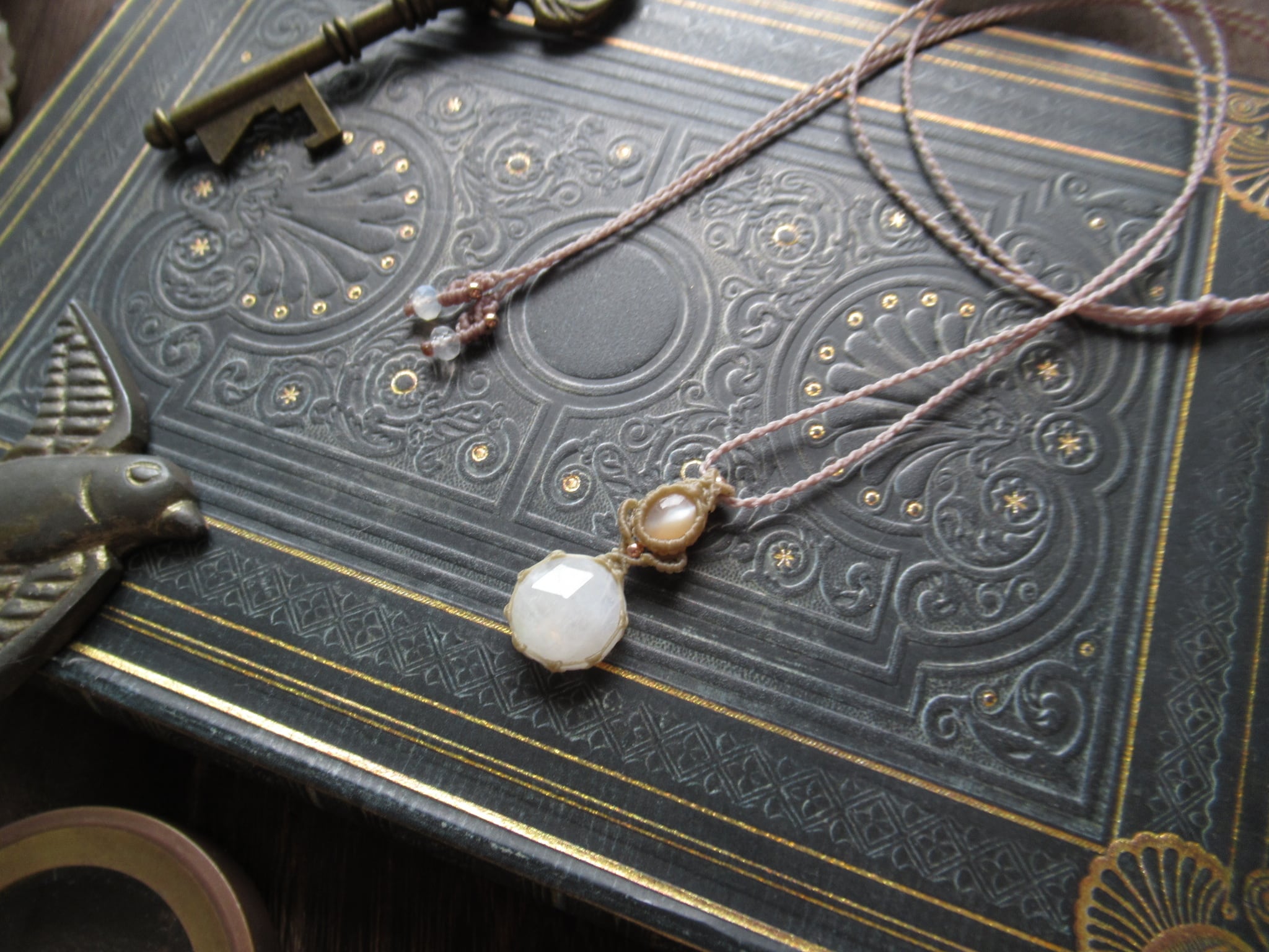 下にはローズカットのレインボームーンストーン(ホワイトラブラドライト)と宝石質のオレンジムーンストーンキャッツアイを組み合わせました。