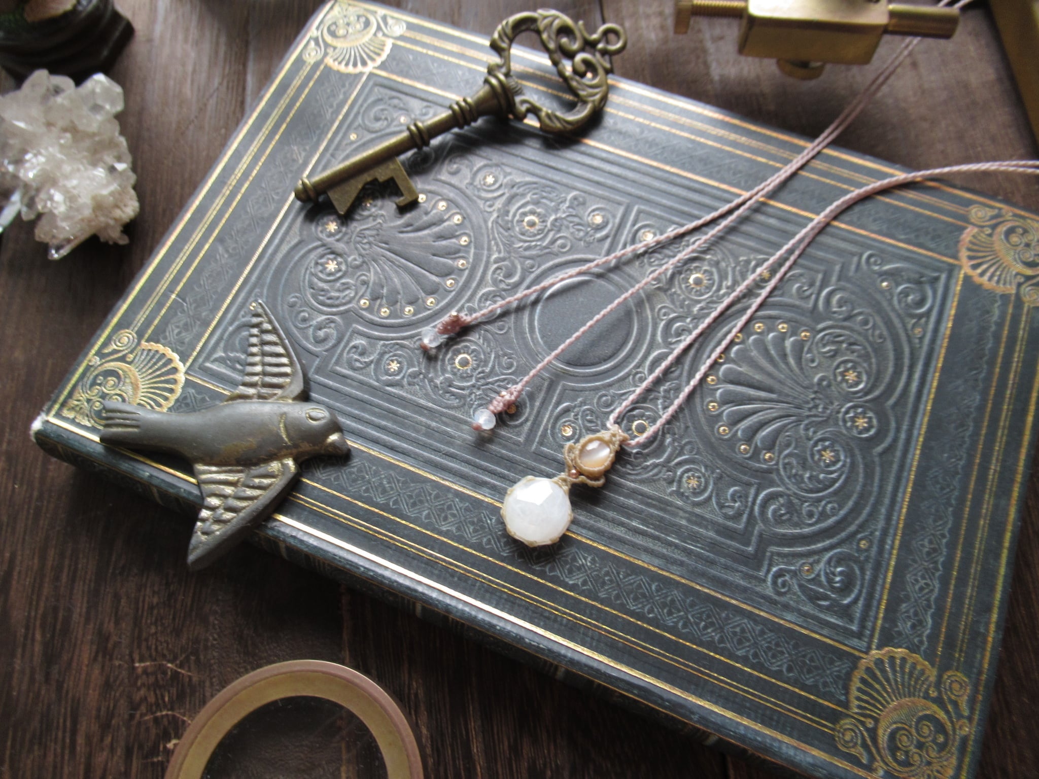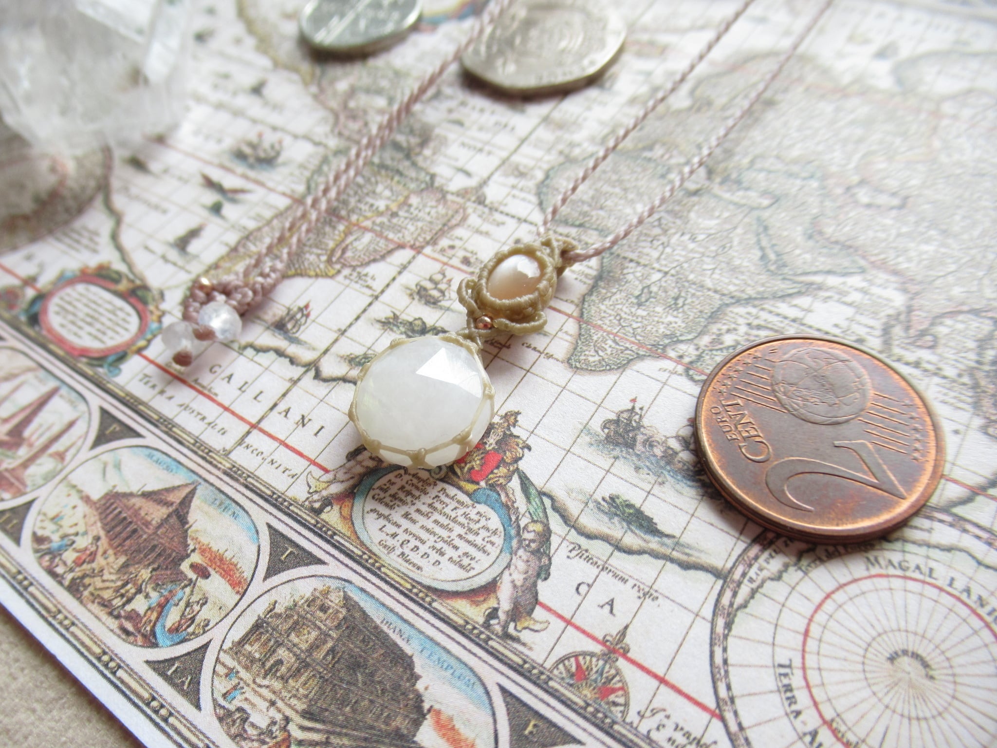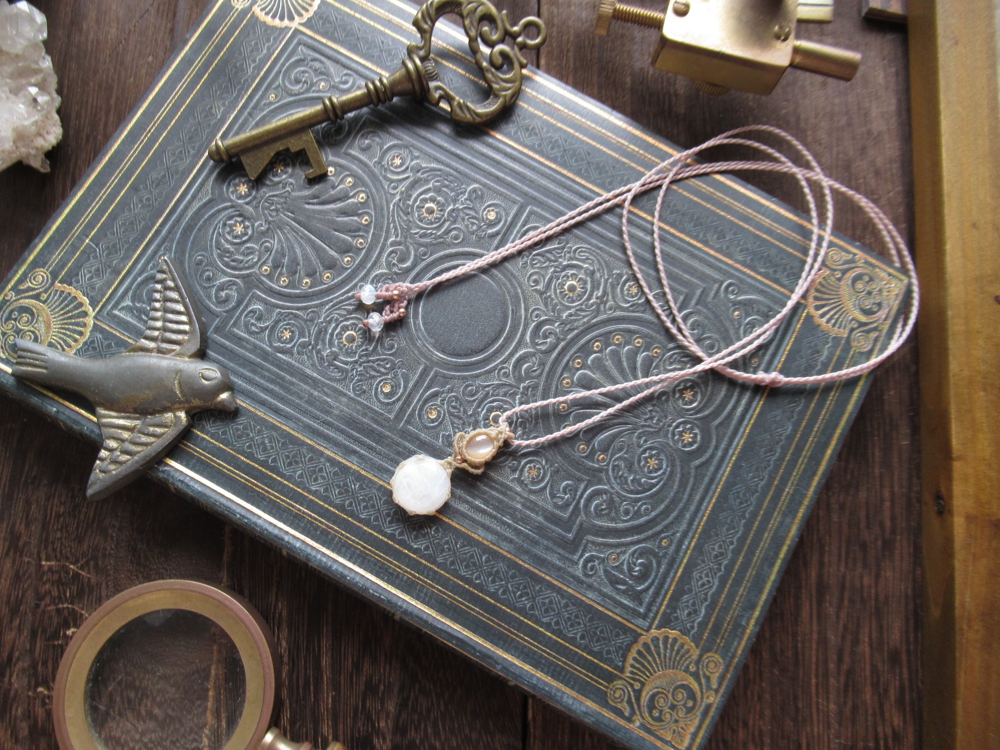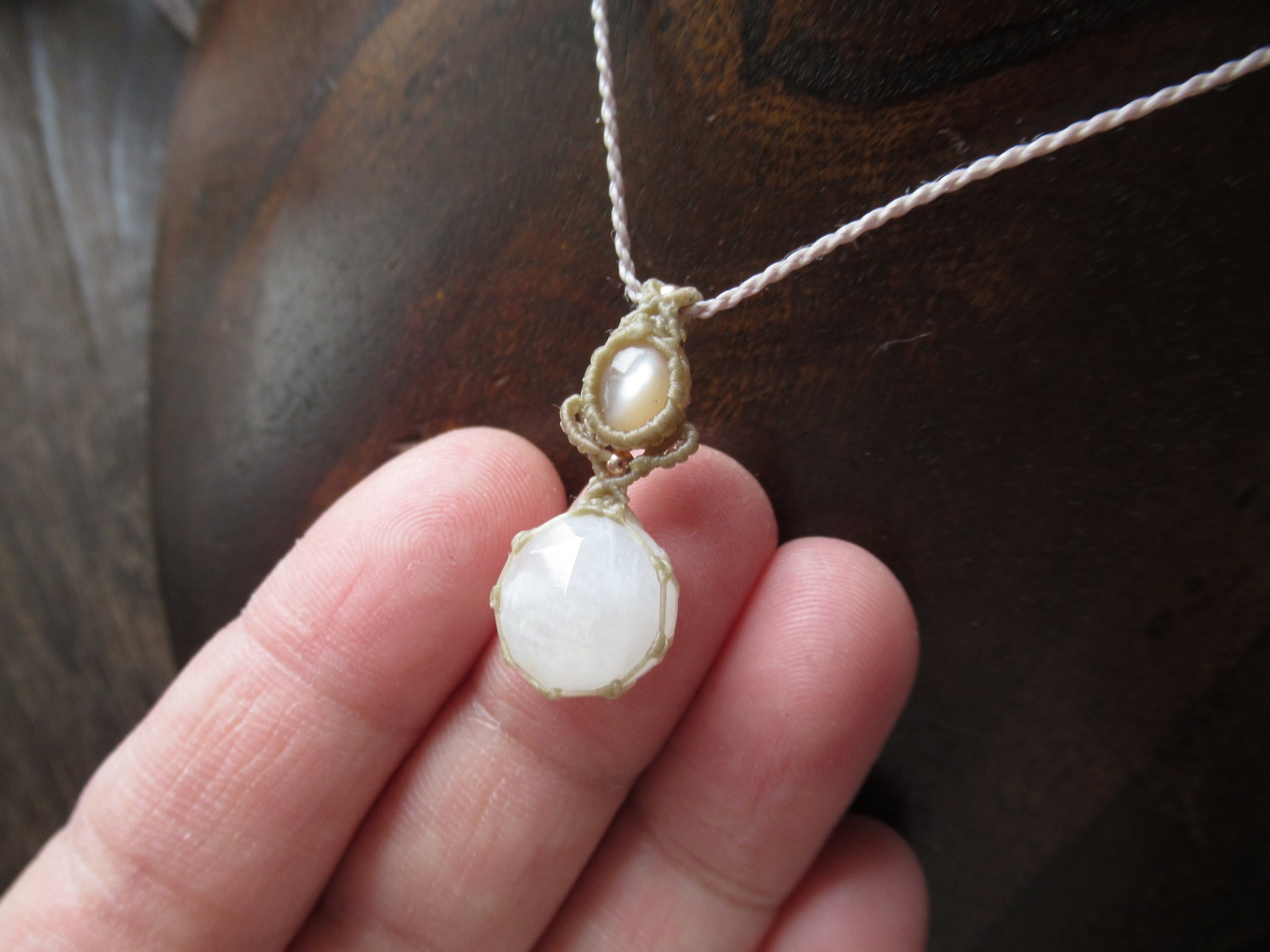下にはローズカットのレインボームーンストーン(ホワイトラブラドライト)と宝石質のオレンジムーンストーンキャッツアイを組み合わせました。