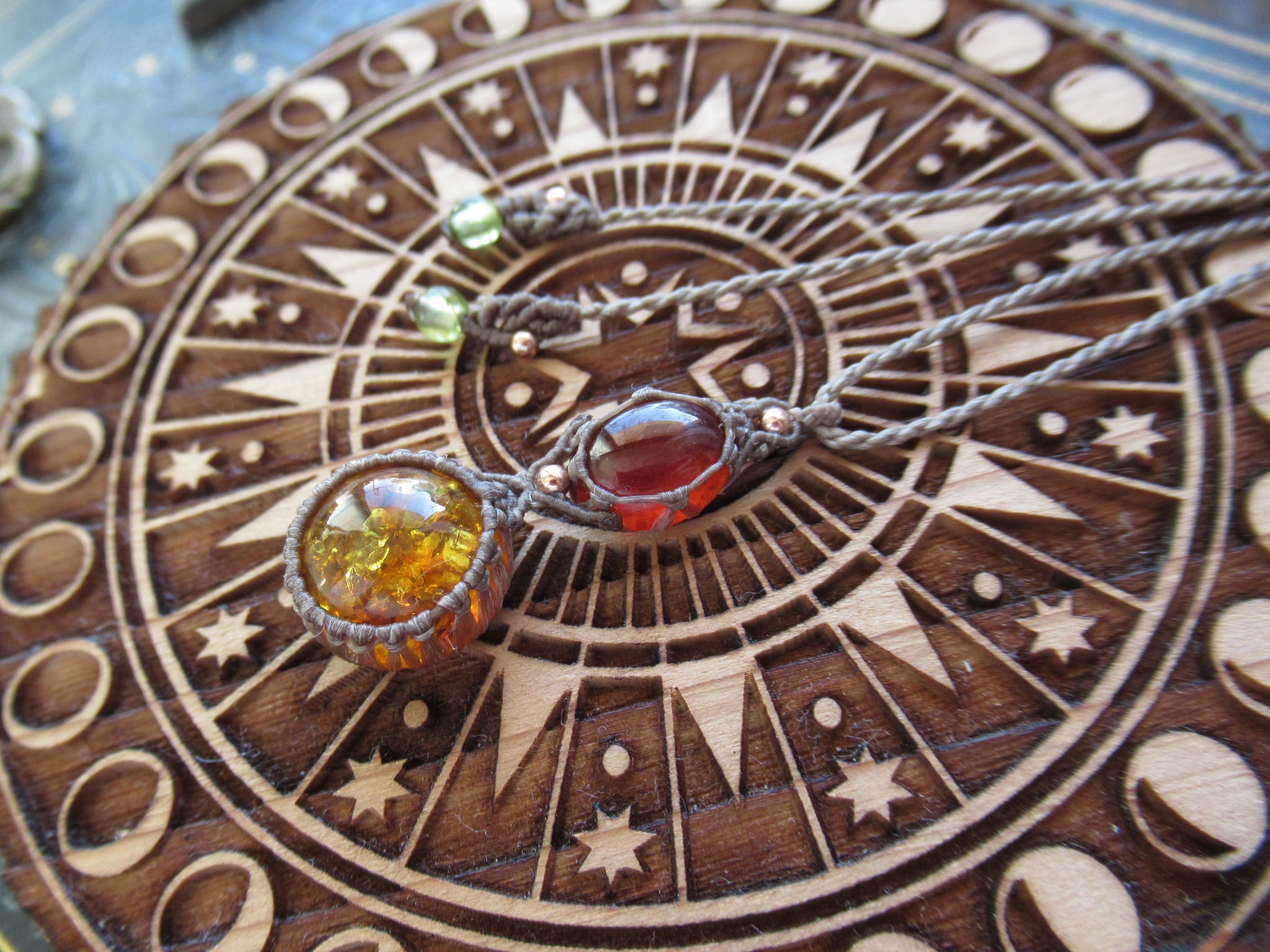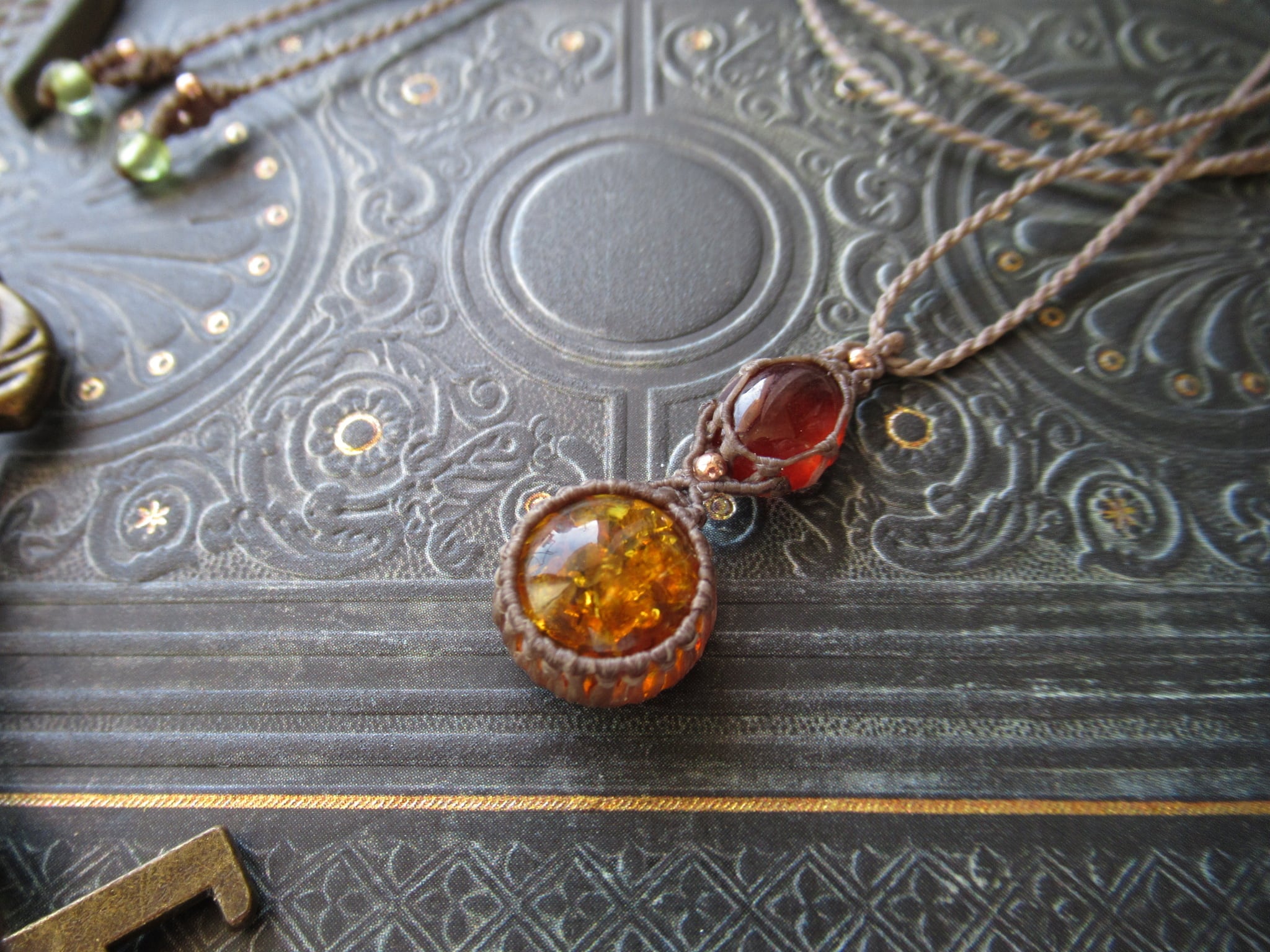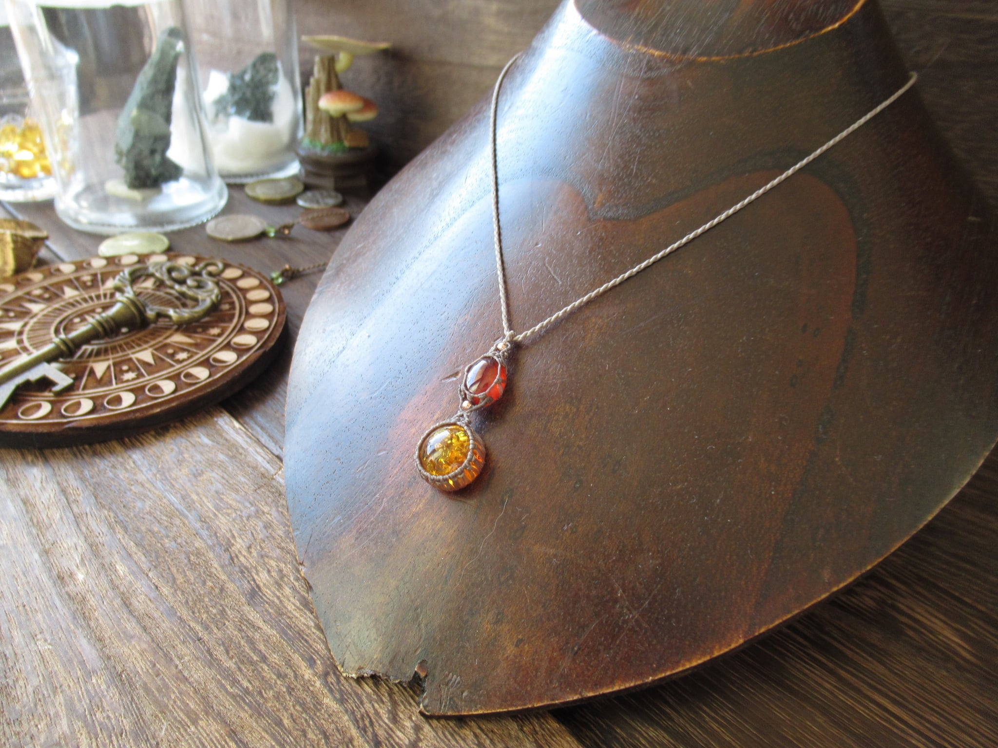 上にヘソナイトガーネット、下にバルティックアンバーを連ねた、縦ラインのペンダントです。