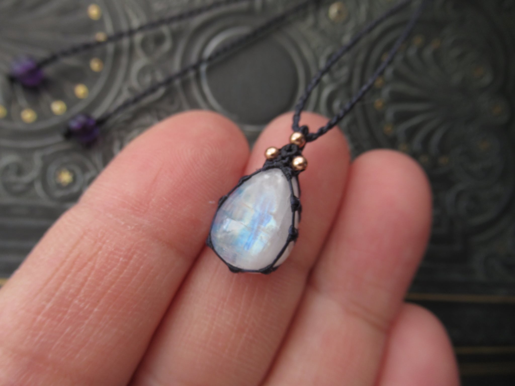 ちいさな雫型のレインボームーンストーン(ホワイトラブラドライト)を日常使いしやすいシンプルなペンダントへお仕立ていたしました。