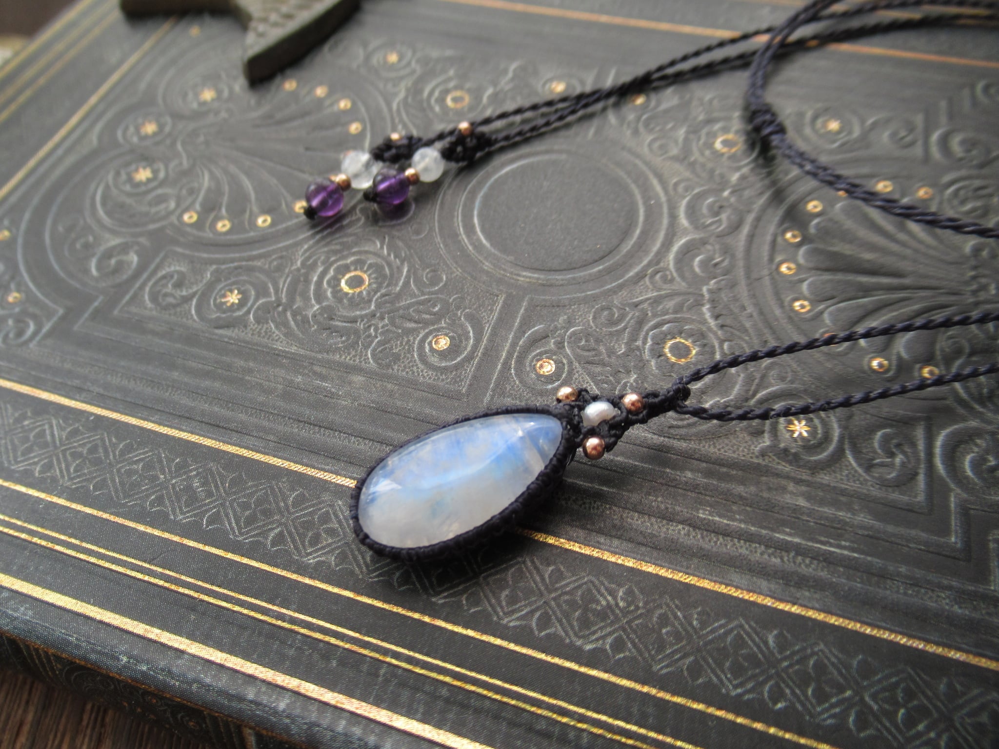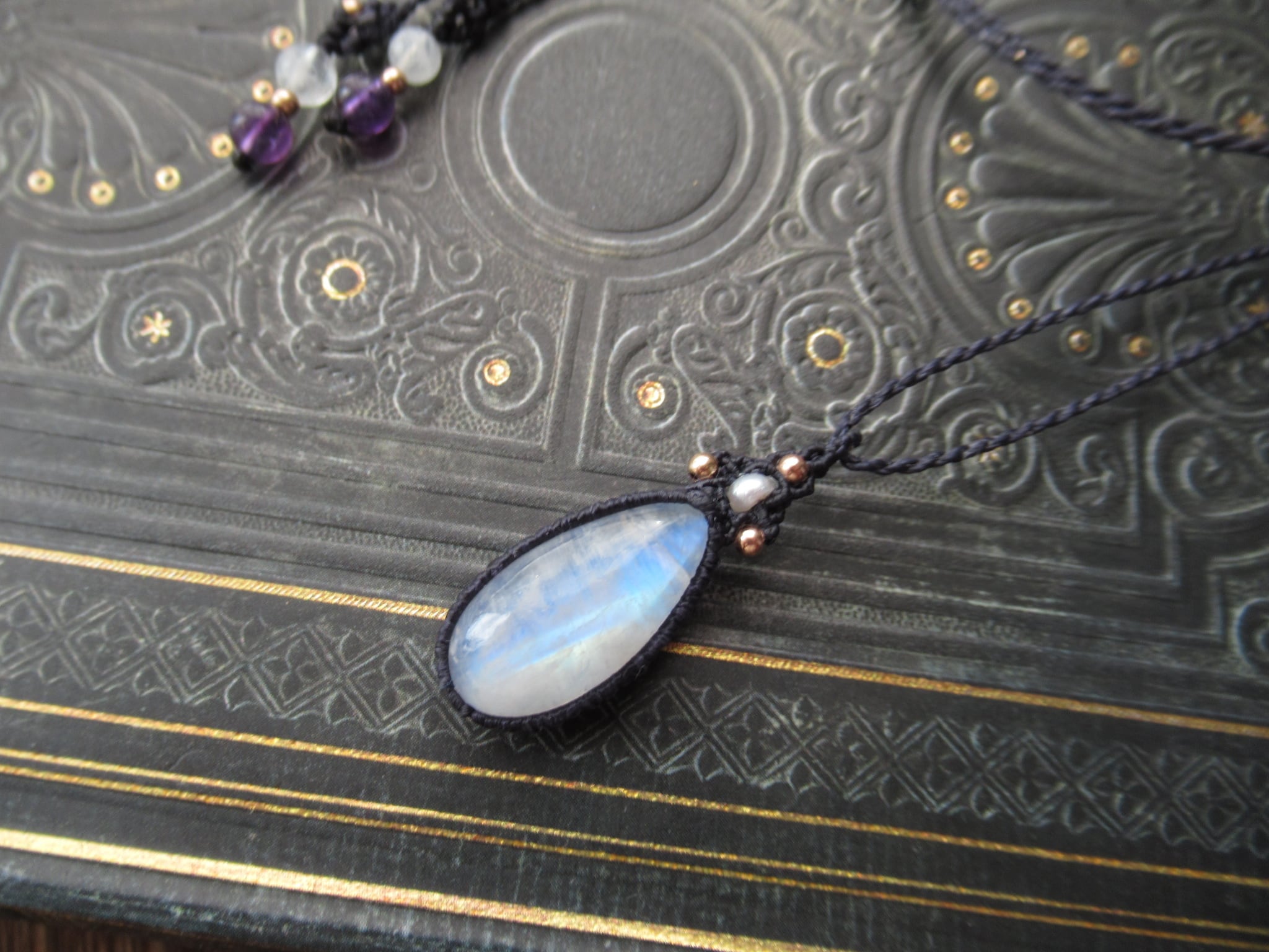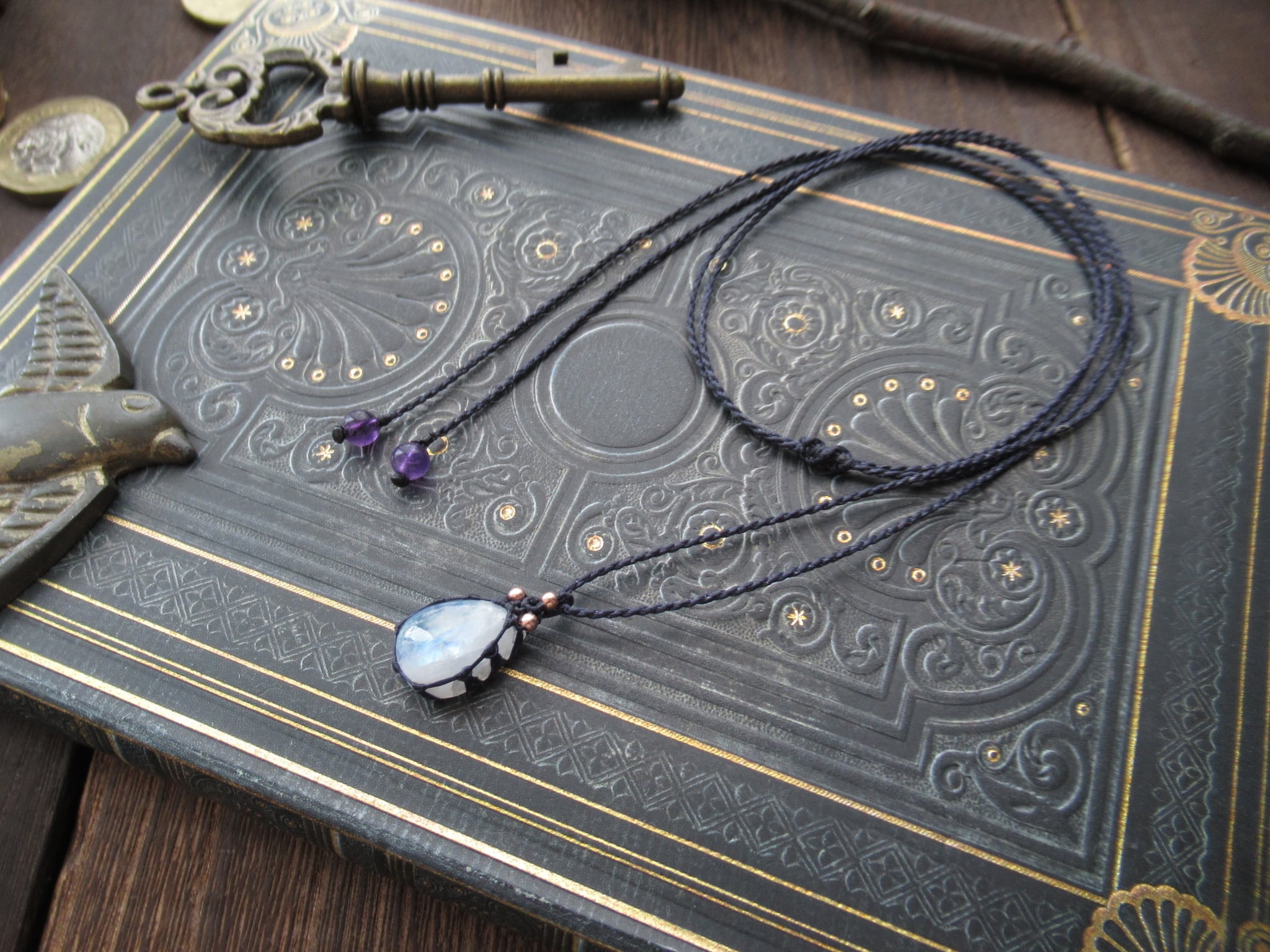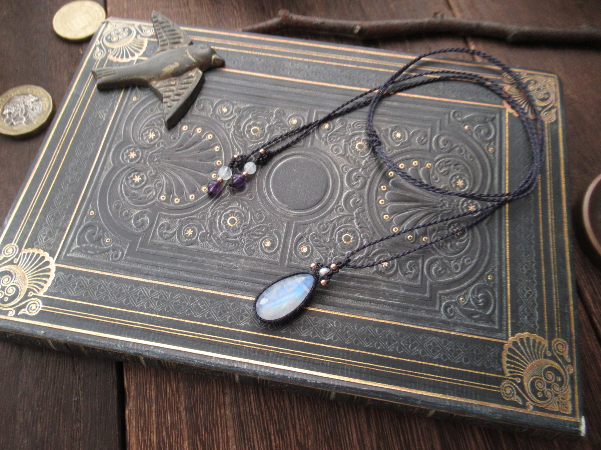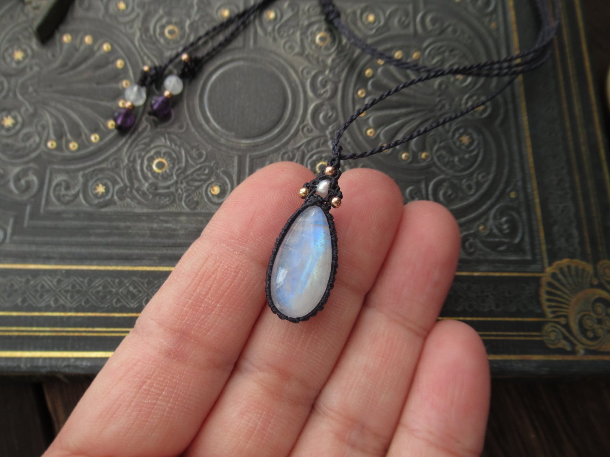 細長い雫型のレインボームーンストーン(ホワイトラブラドライト)を日常使いしやすいシンプルなペンダントへお仕立ていたしました。