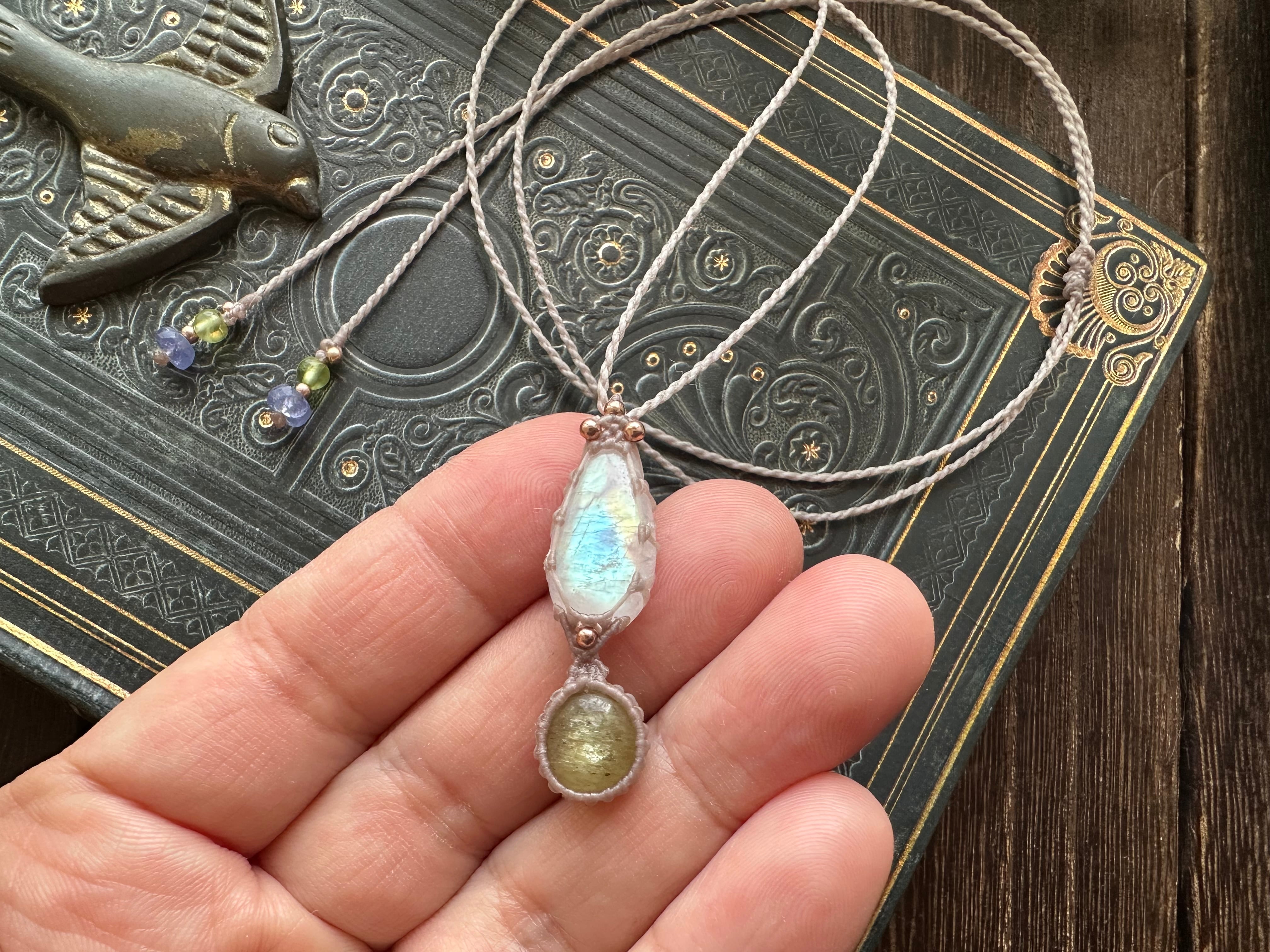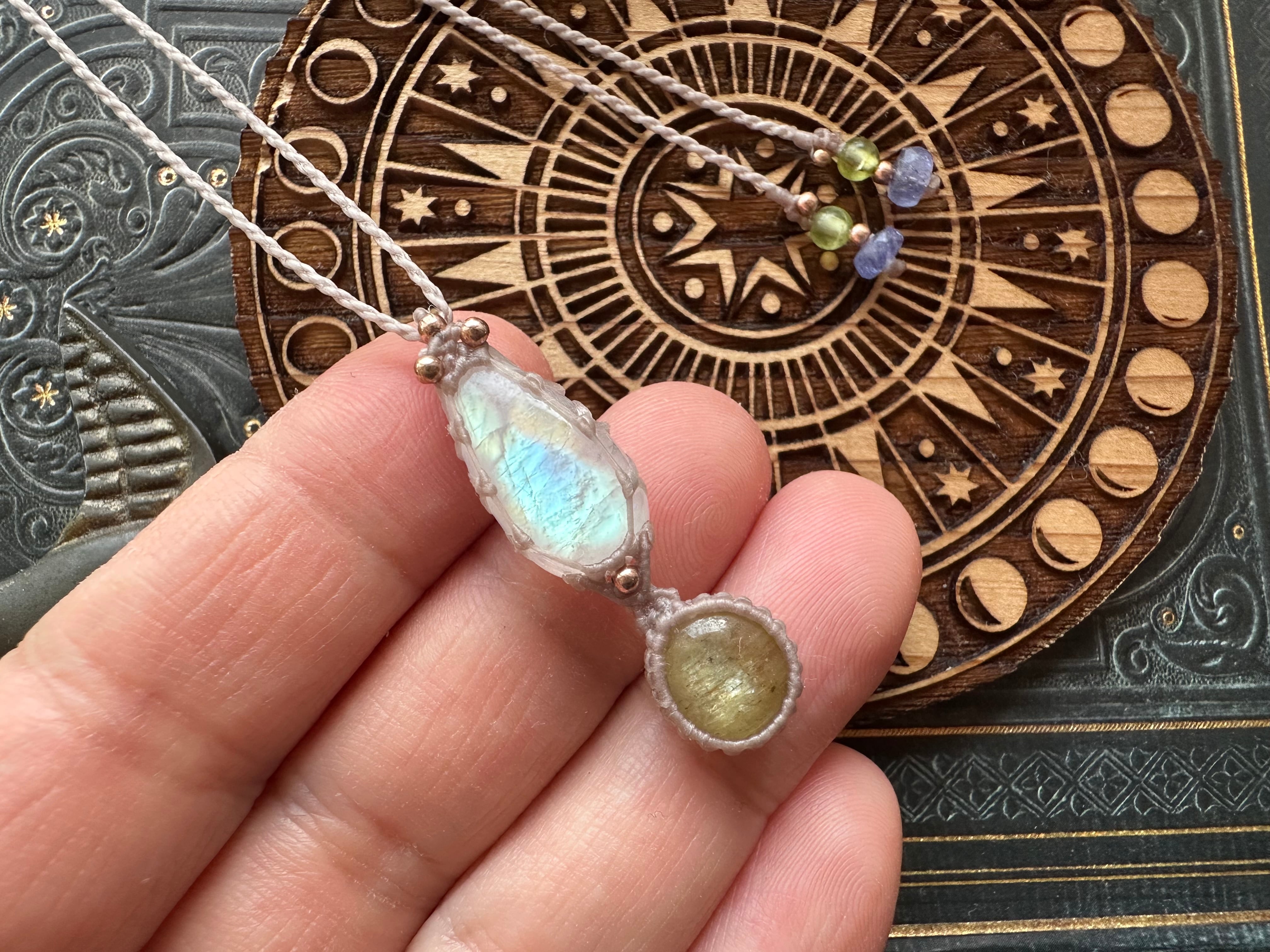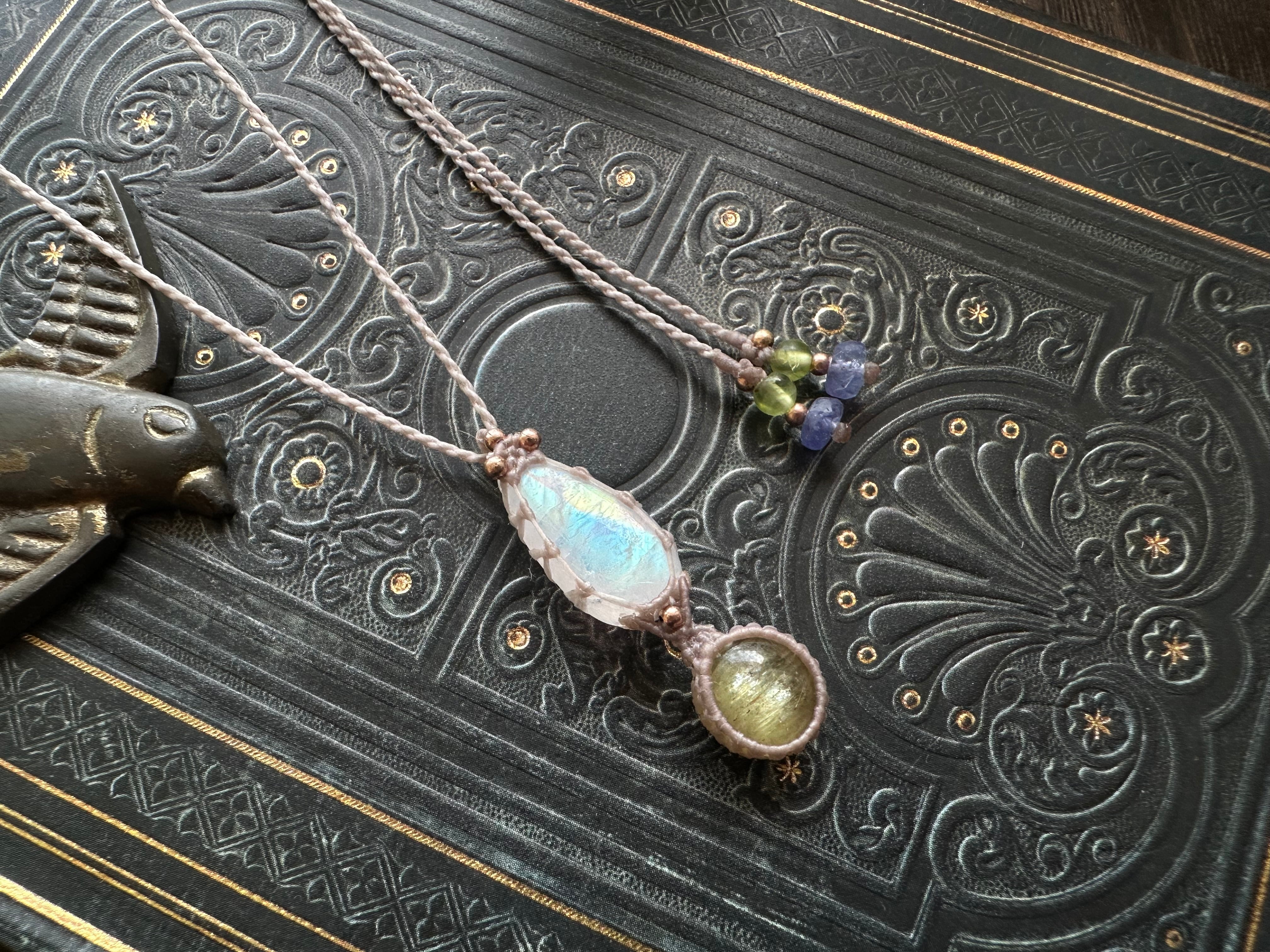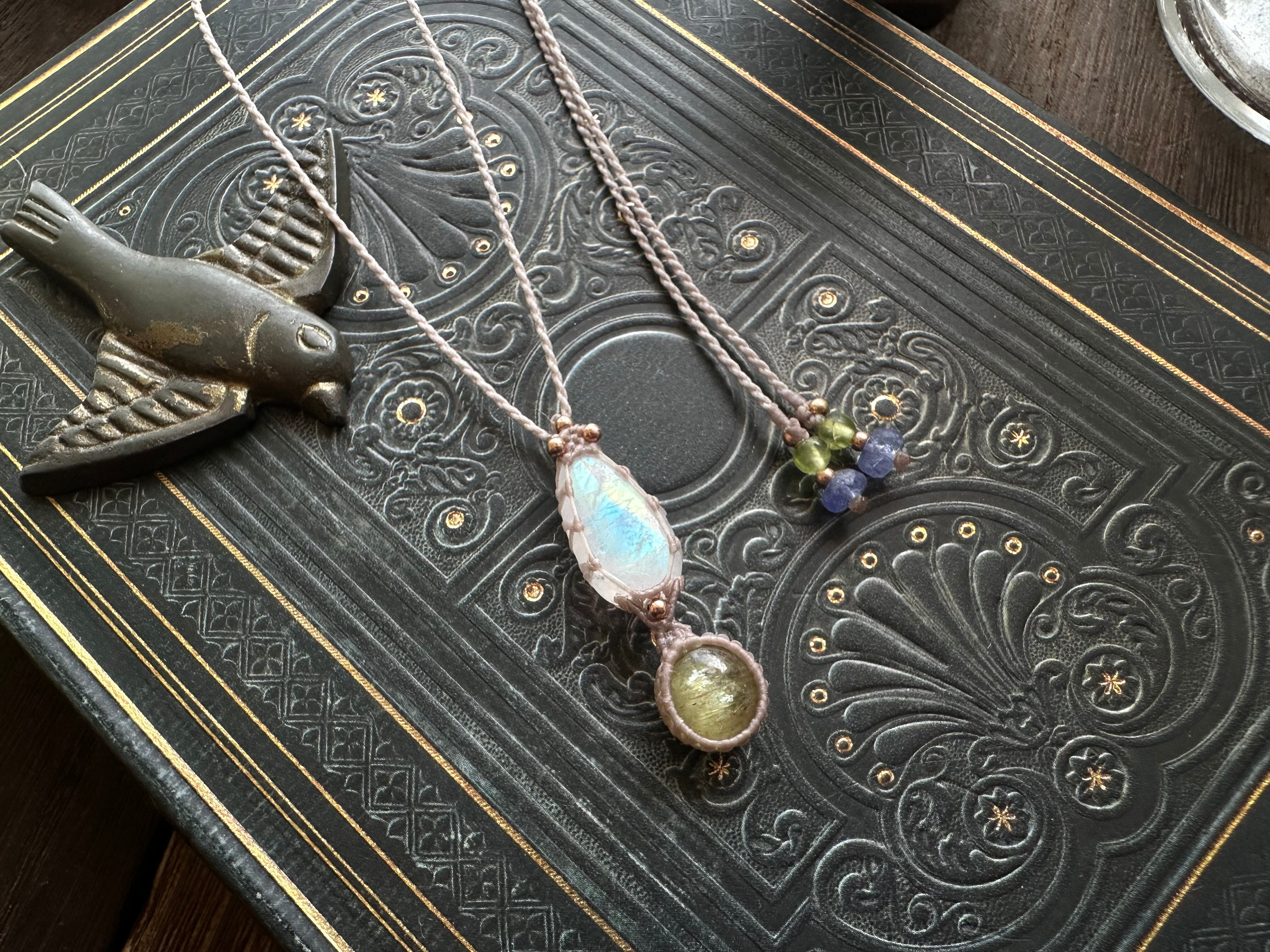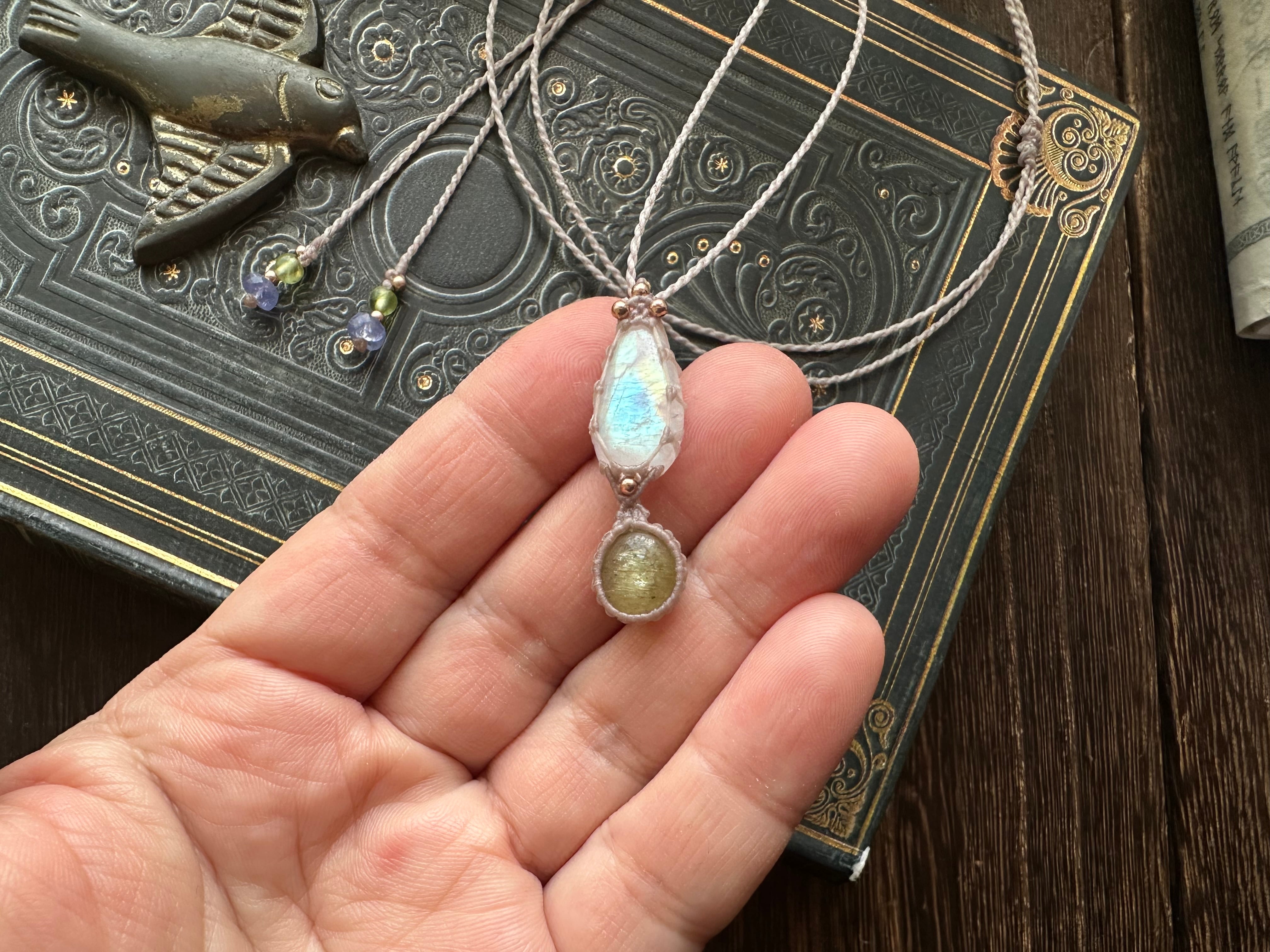 月の光が夜の海の上に広がる様子をイメージして、イエローアパタイトとレインボームーンストーンでペンダントをお仕立ていたしました。