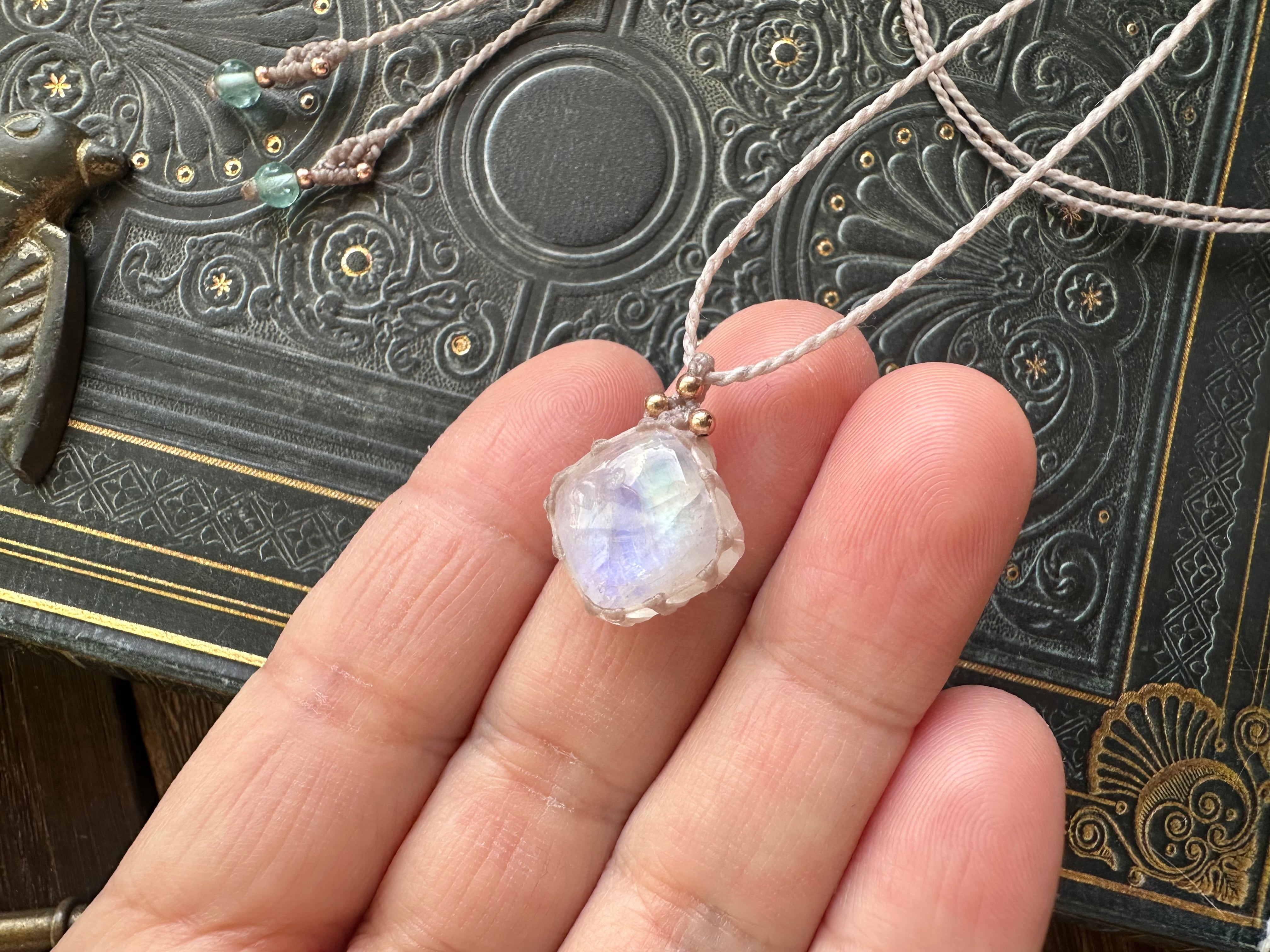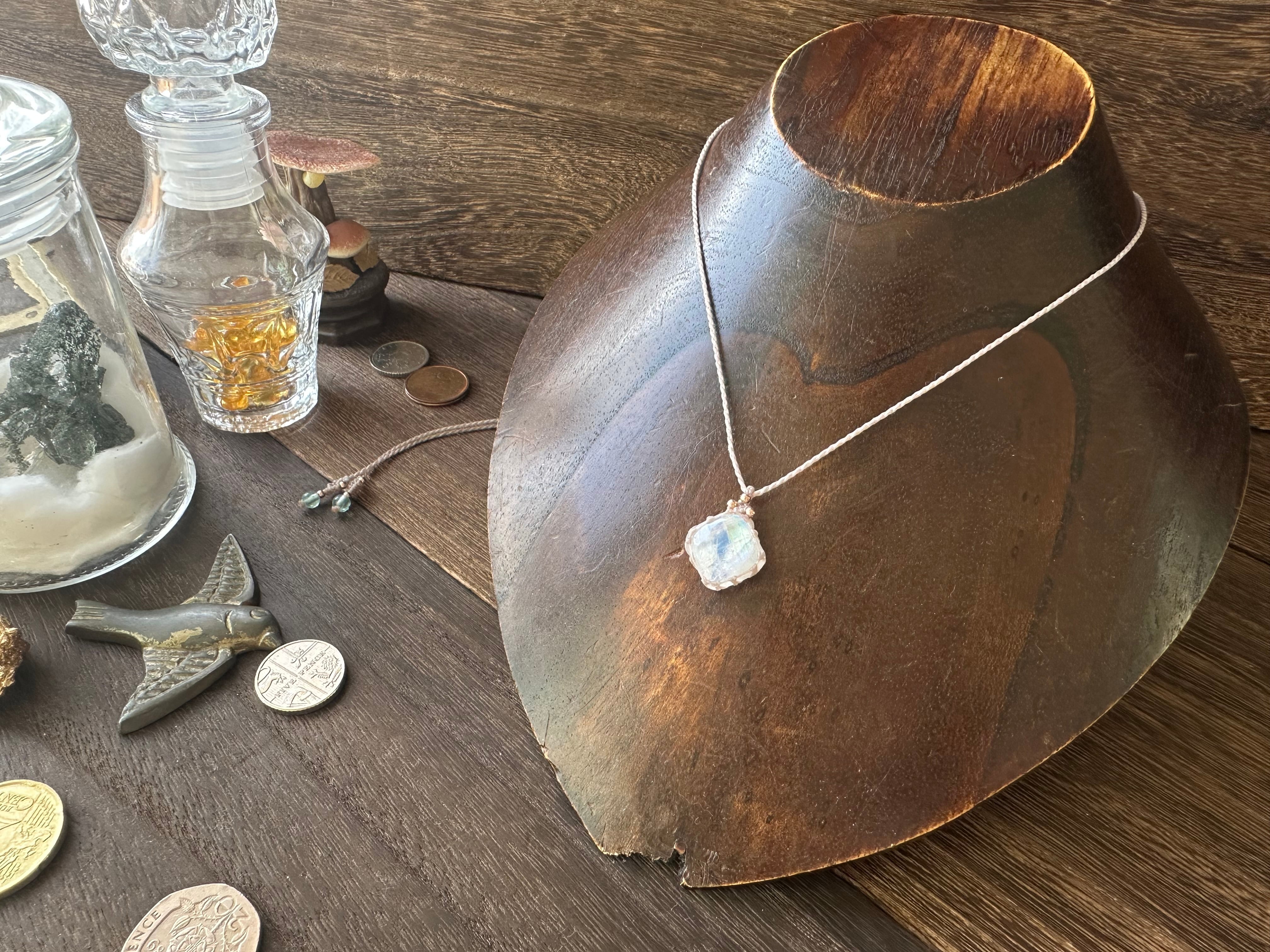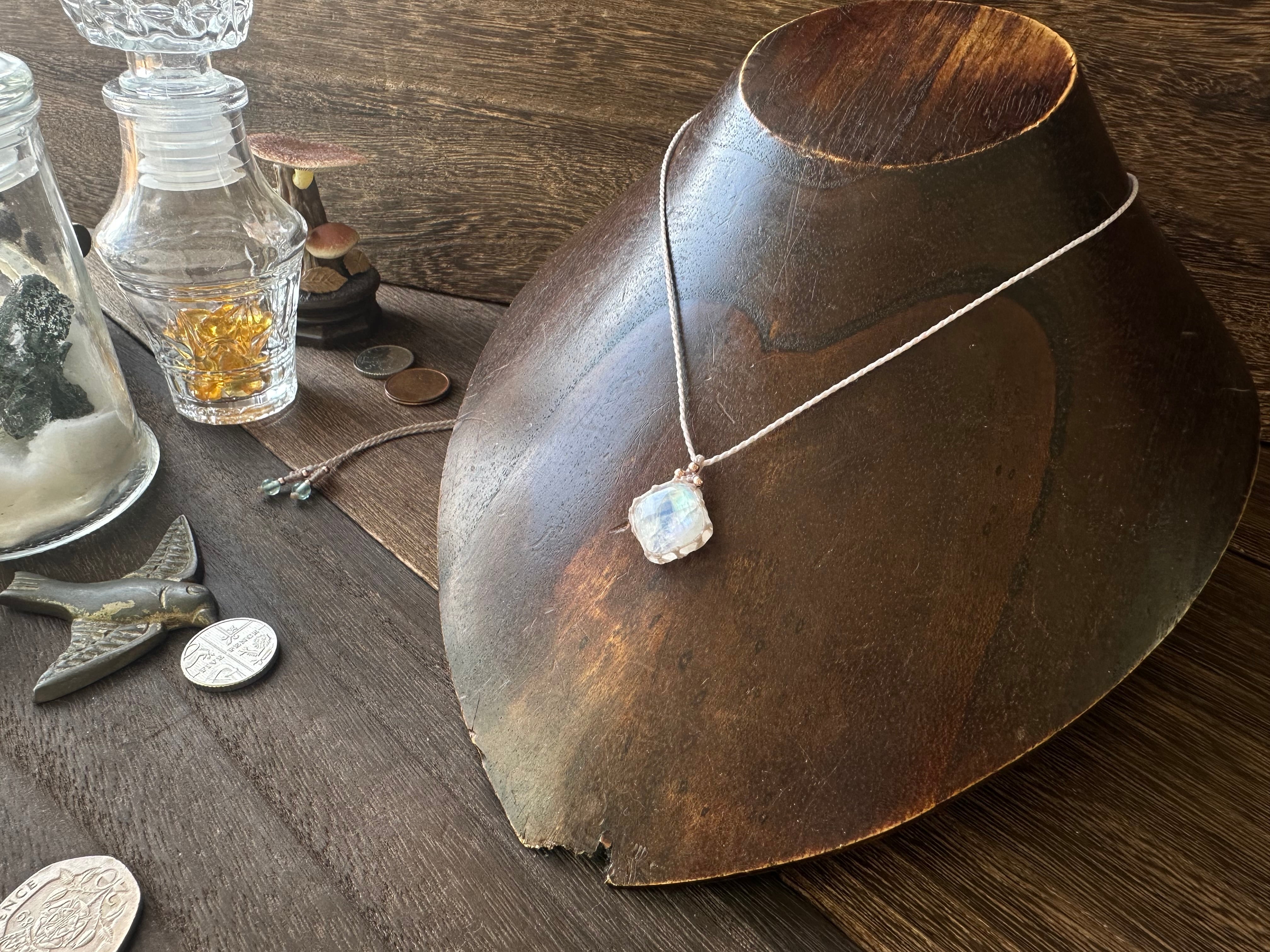 スクエアカットの柔らかく美しいシラーが浮かび上がるレインボームーンストーン(ホワイトラブラドライト)を日常で身につけやすい、シンプルなペンダントにお仕立ていたしました。