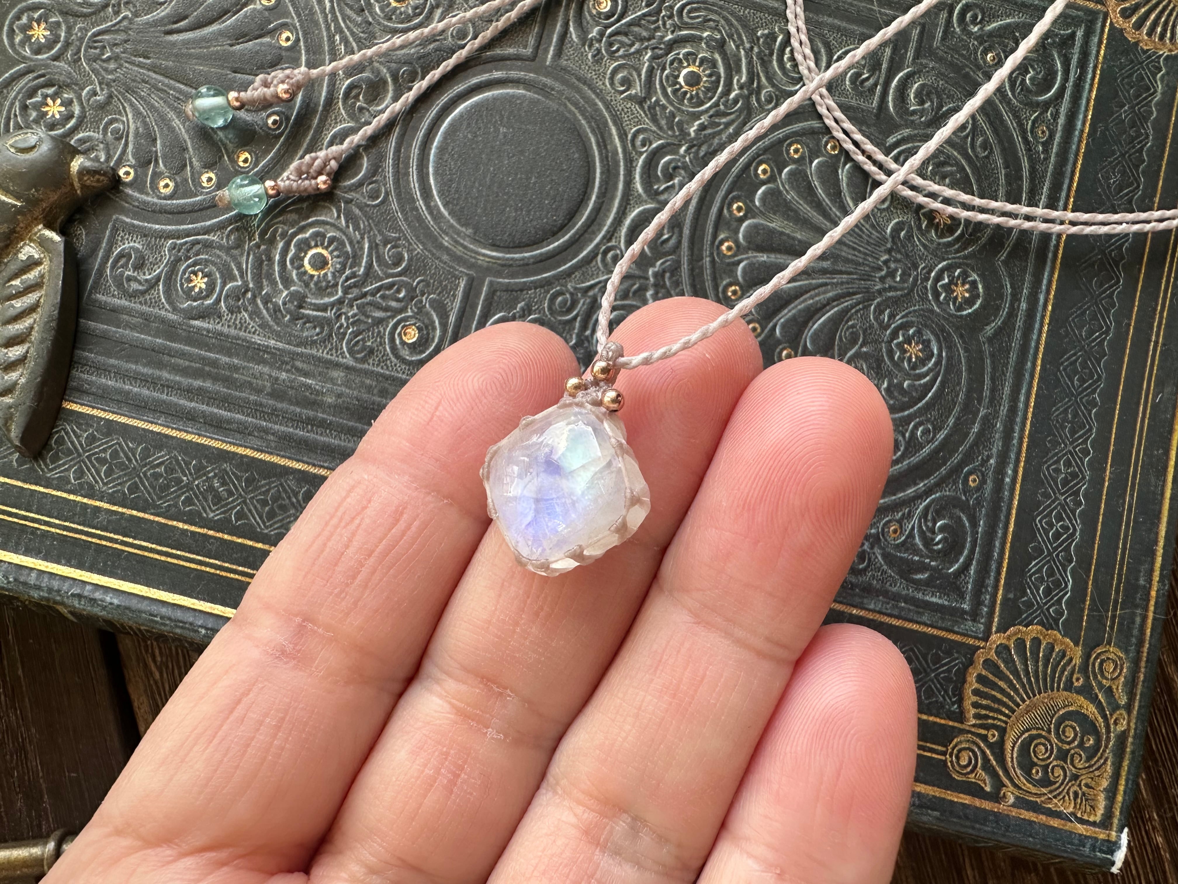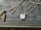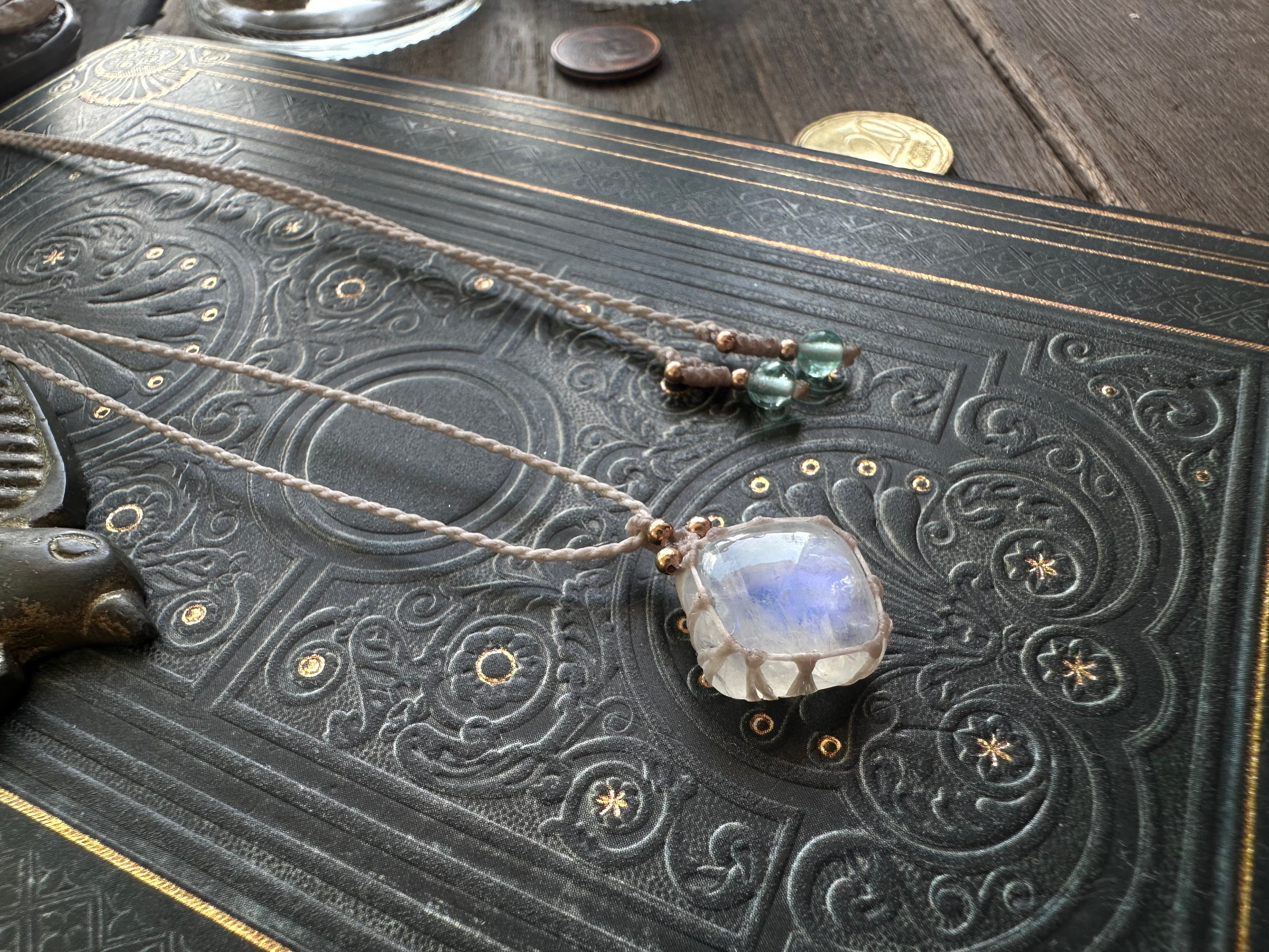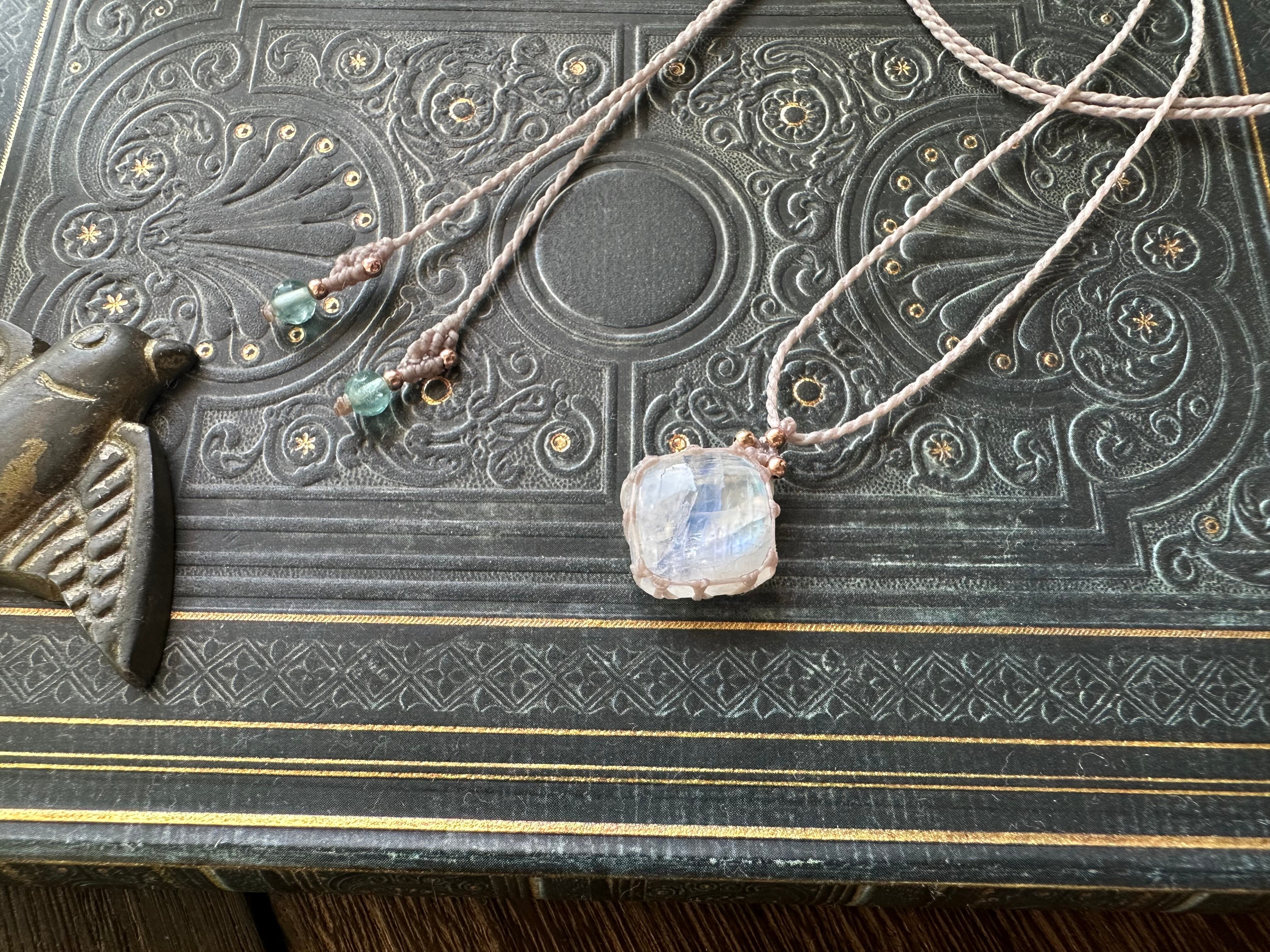 スクエアカットの柔らかく美しいシラーが浮かび上がるレインボームーンストーン(ホワイトラブラドライト)を日常で身につけやすい、シンプルなペンダントにお仕立ていたしました。