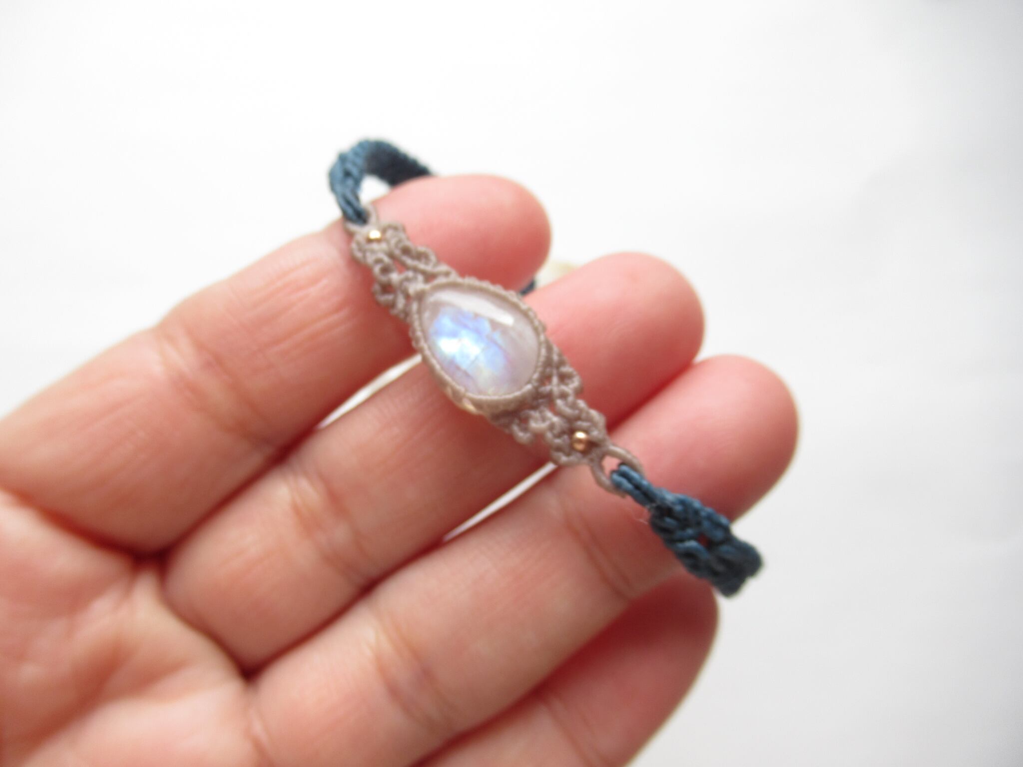繊細でやわらかなシラーを見せてくれる、レインボームーンストーン(ホワイトラブラドライト)を繊細な編み込みのブレスレットにお仕立ていたしました。