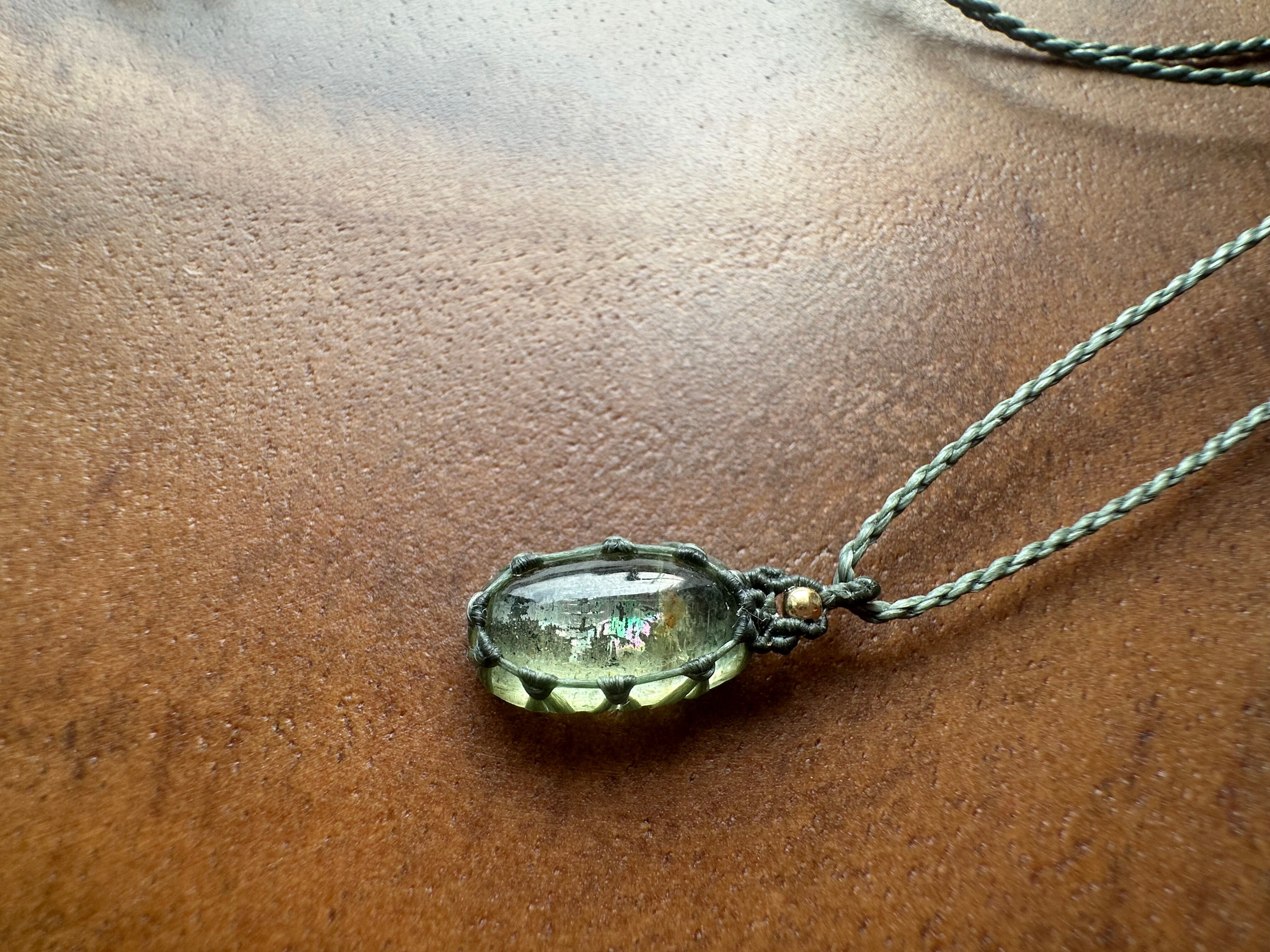 角度によって虹が浮かび上がるグリーンベリルのペンダントです。