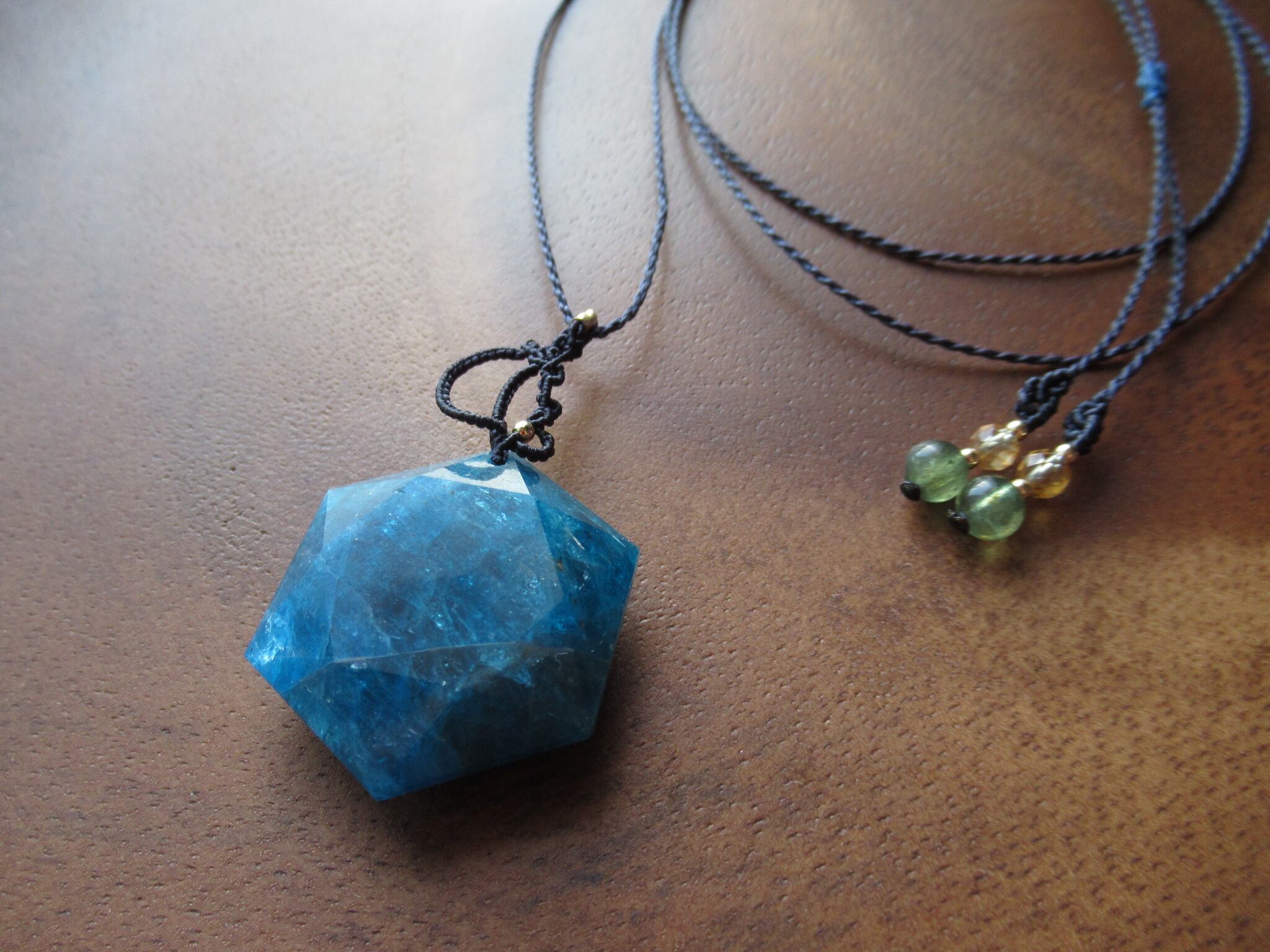 六芒星の形にデザインカットされた青みの強いブルーアパタイトでペンダントをお仕立ていたしました。