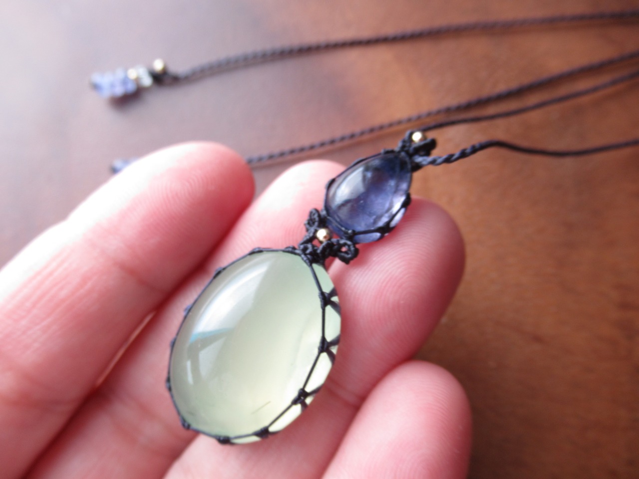 雫型のアイオライトとぷっくり大粒のプレナイトでペンダントをお仕立ていたしました。