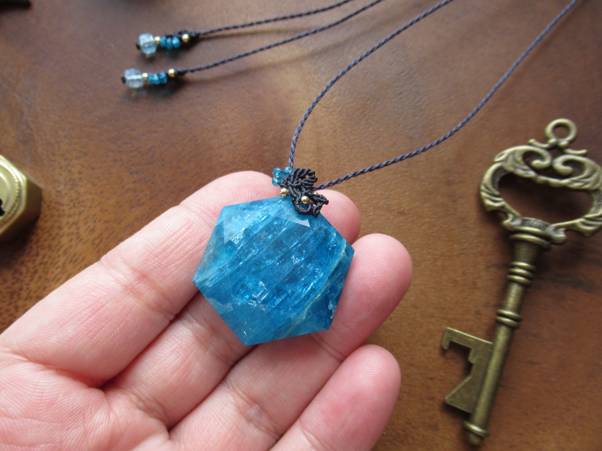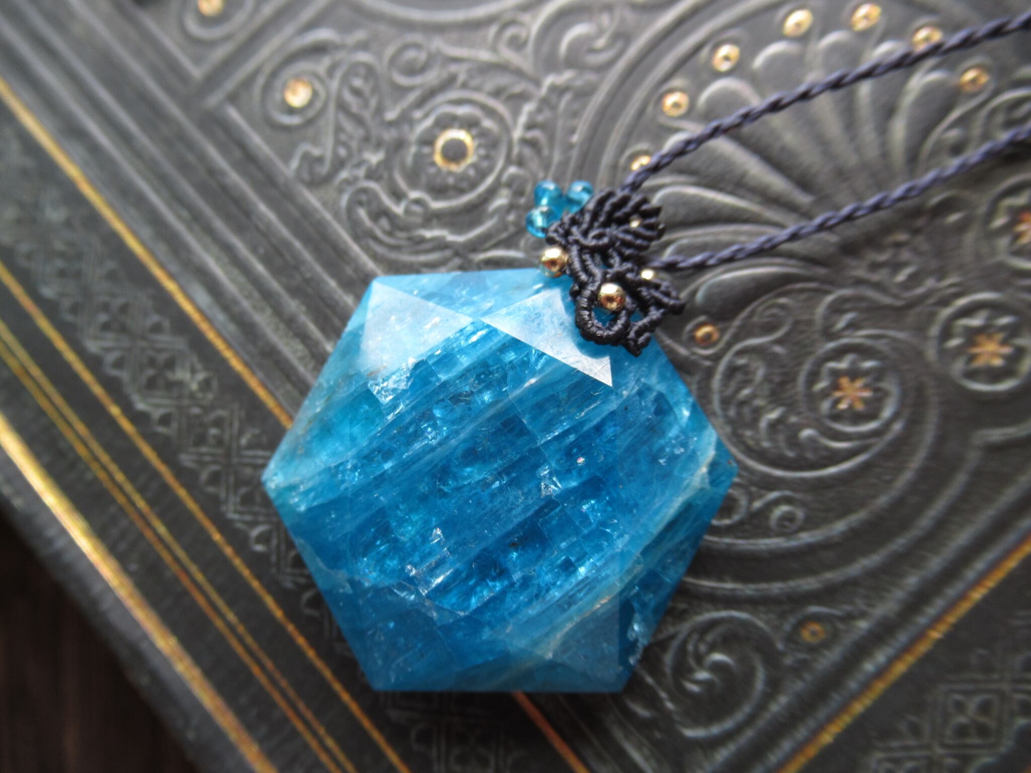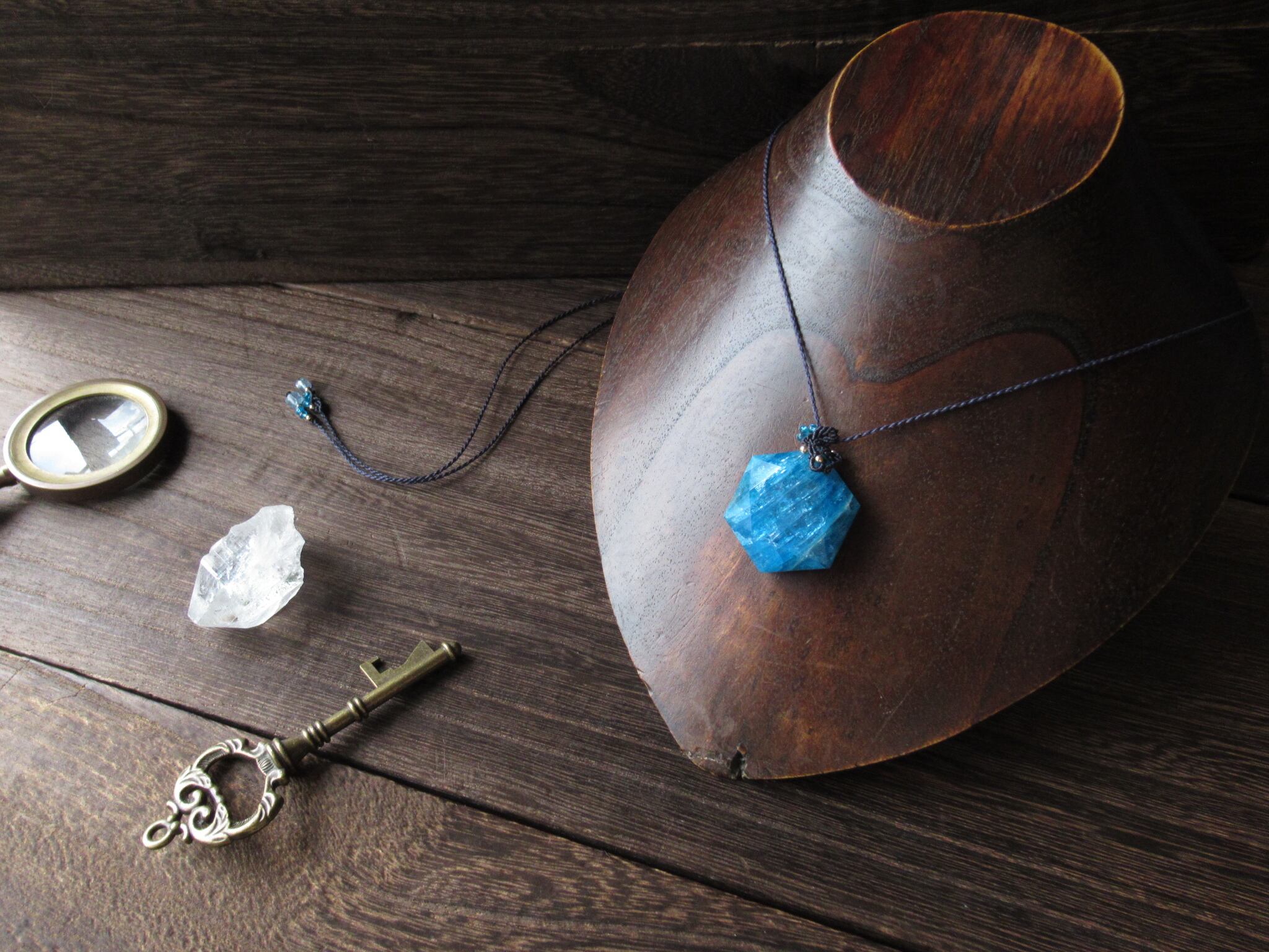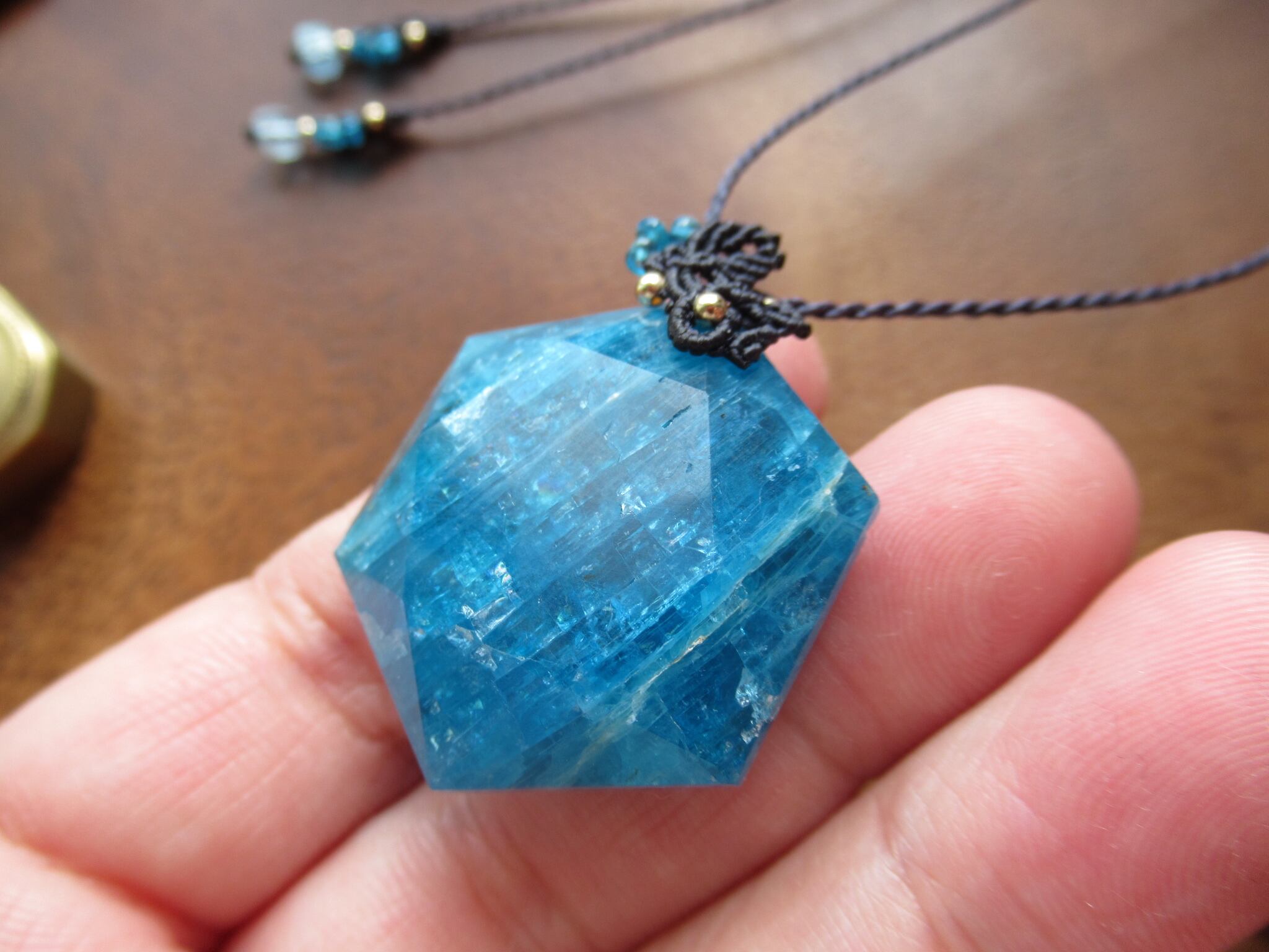 六芒星の形にデザインカットされた青みの強いブルーアパタイトでペンダントをお仕立ていたしました。