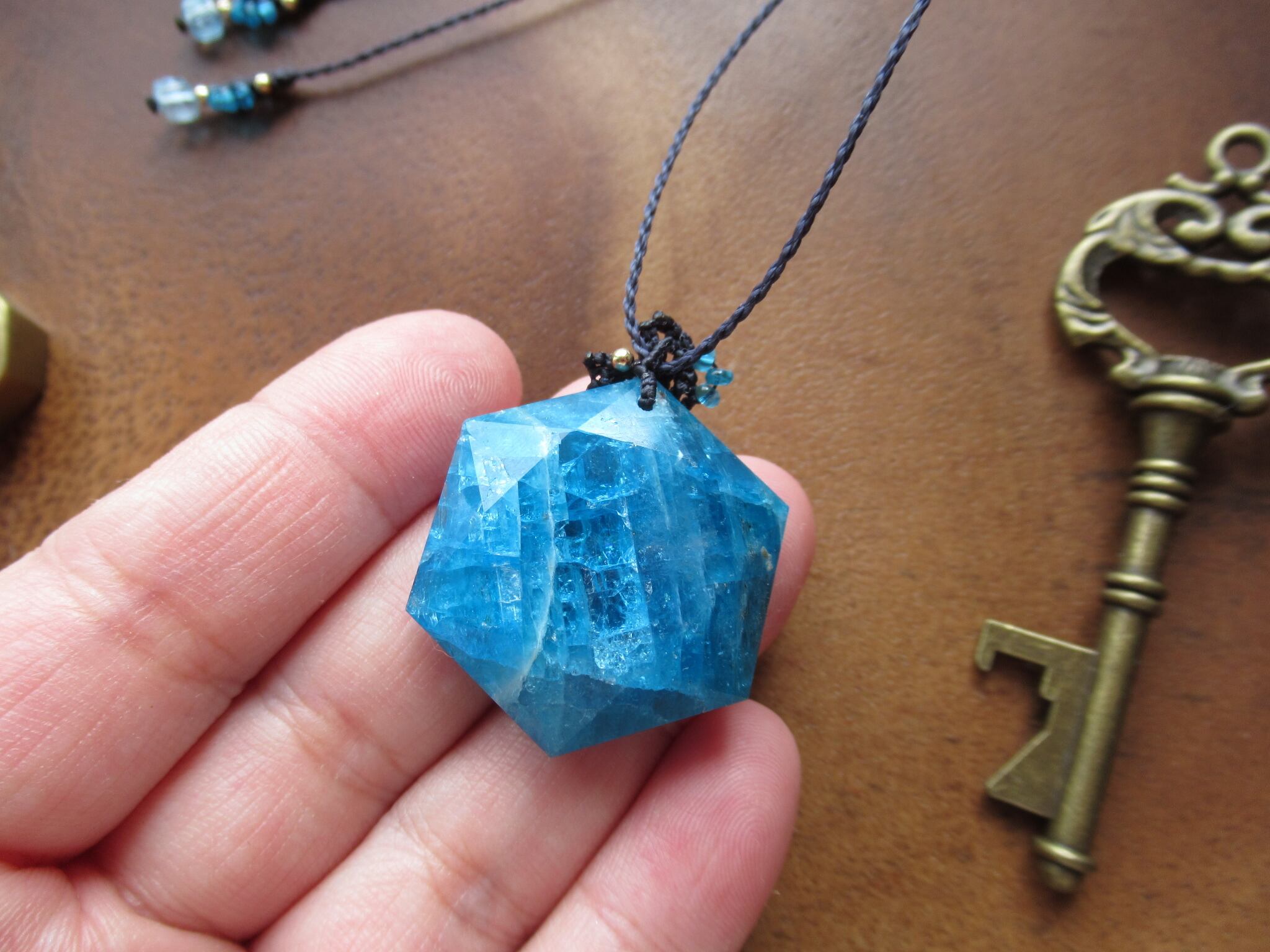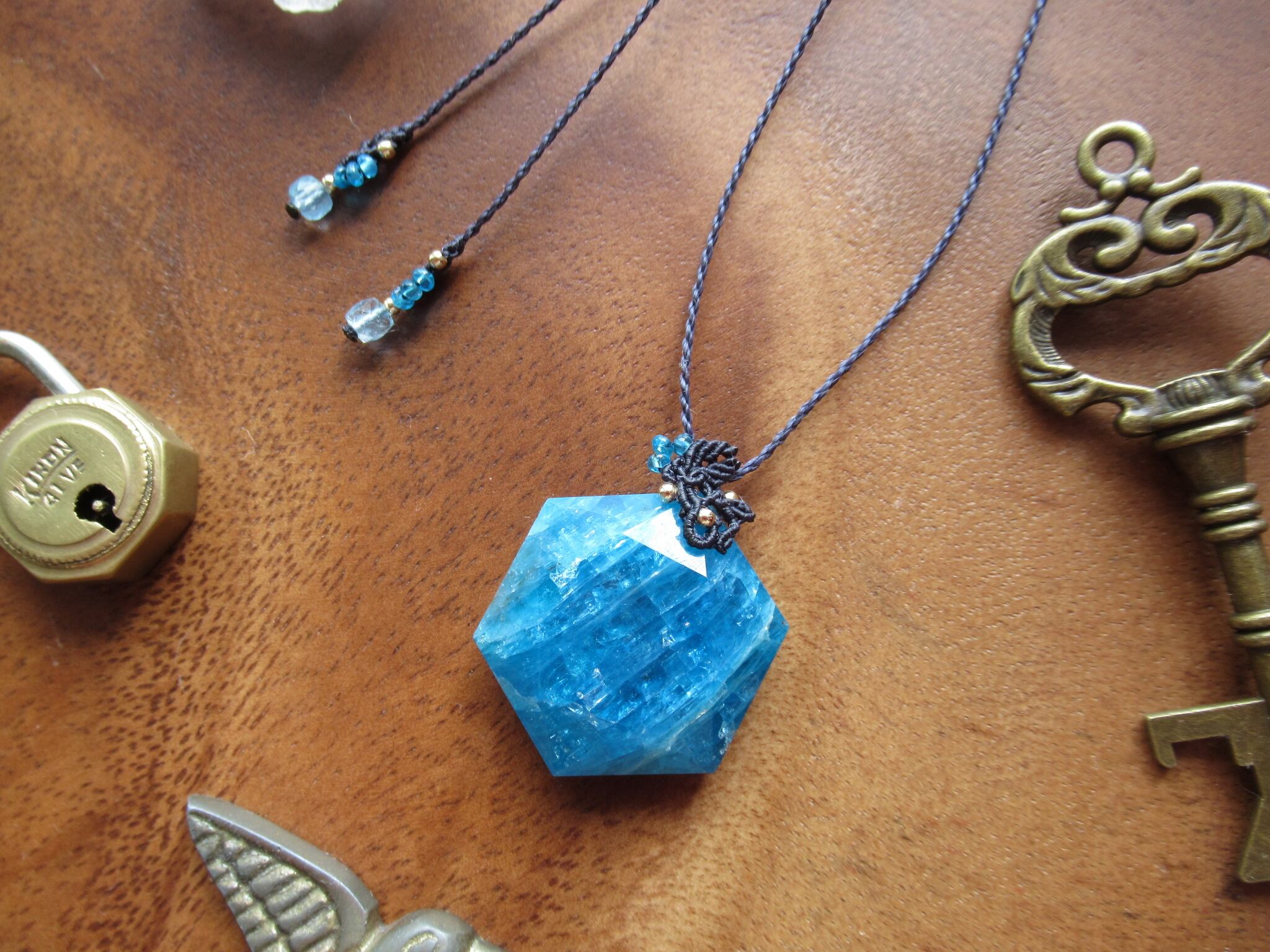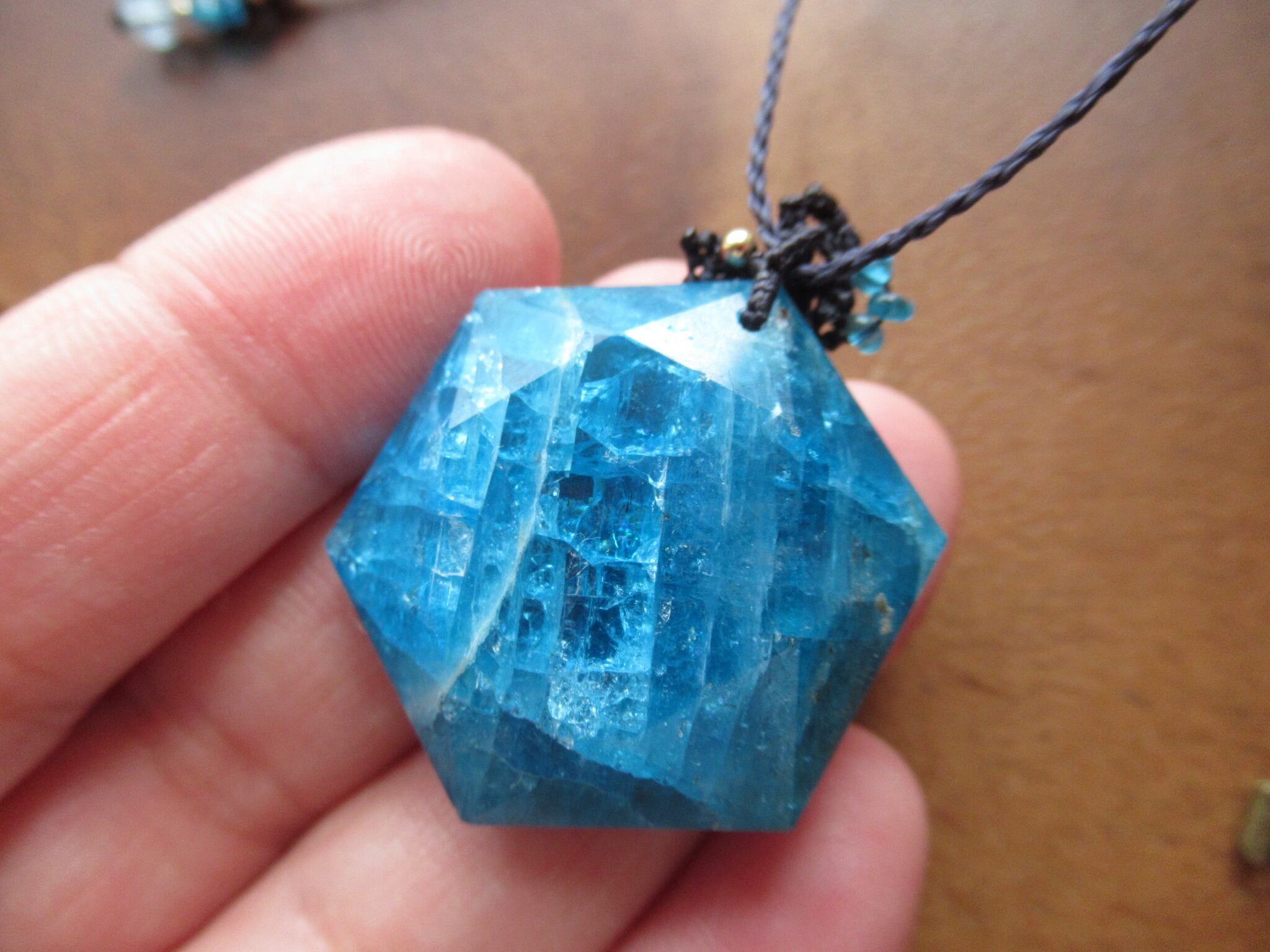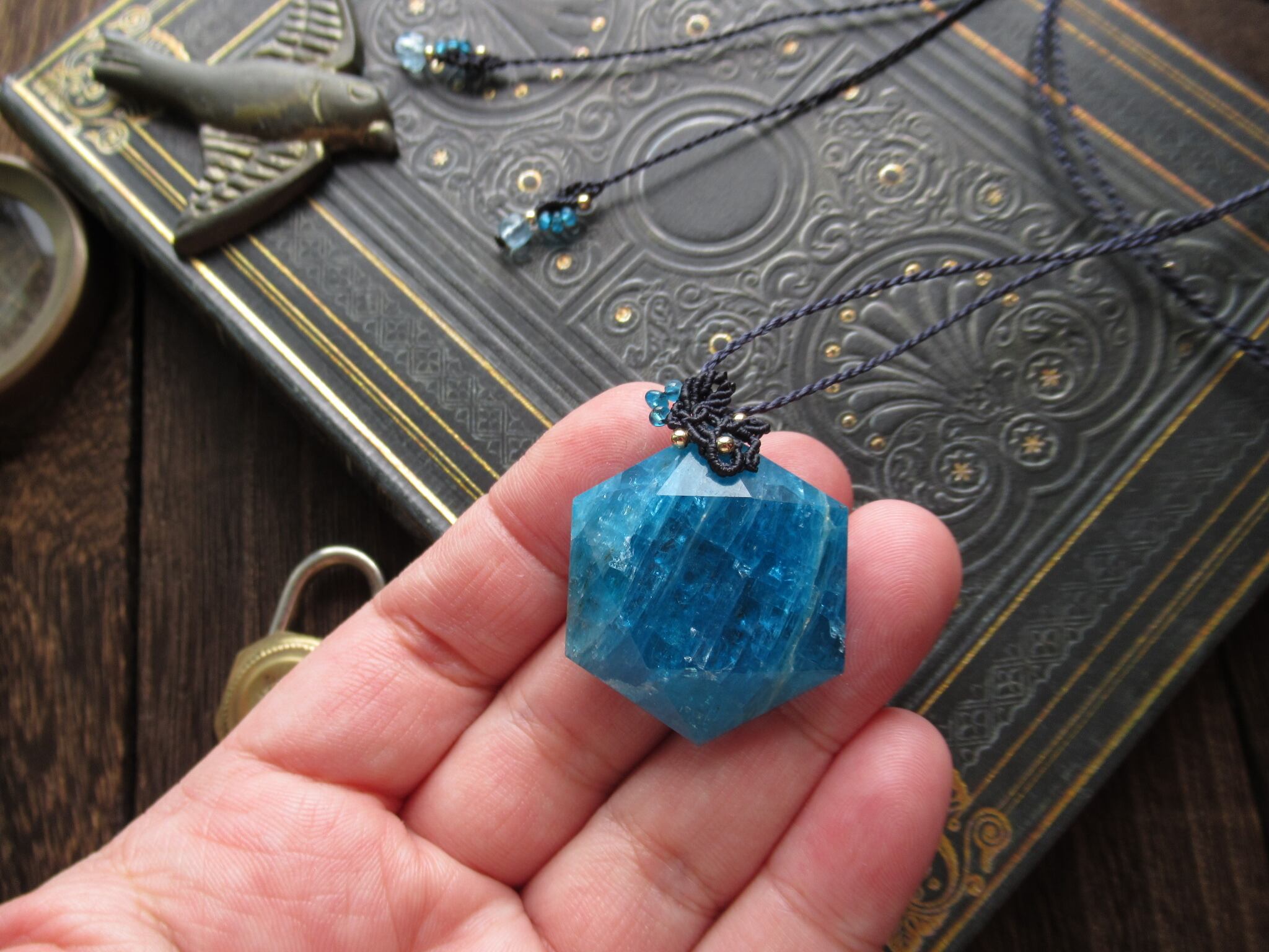六芒星の形にデザインカットされた青みの強いブルーアパタイトでペンダントをお仕立ていたしました。